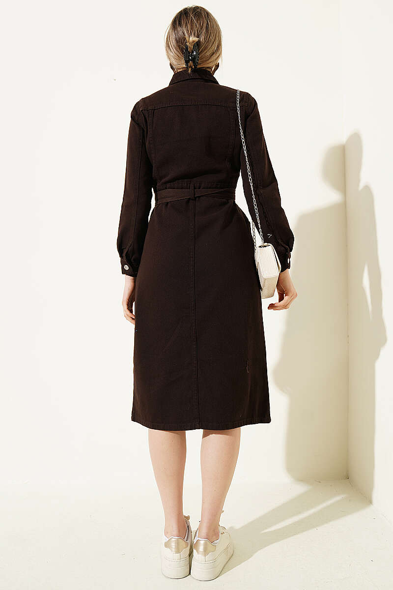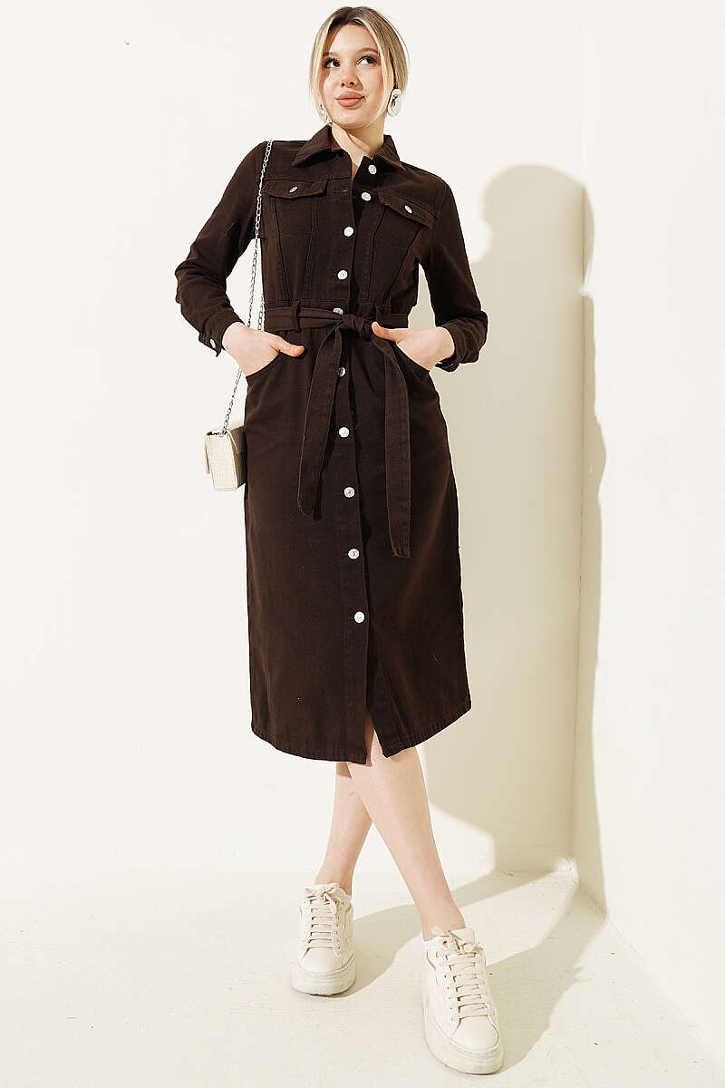 Sahte Cepli Kuşaklı Kot Elbise Kahve