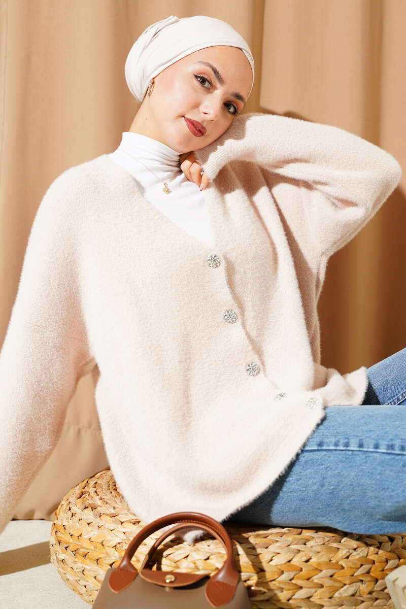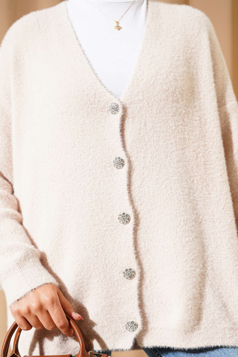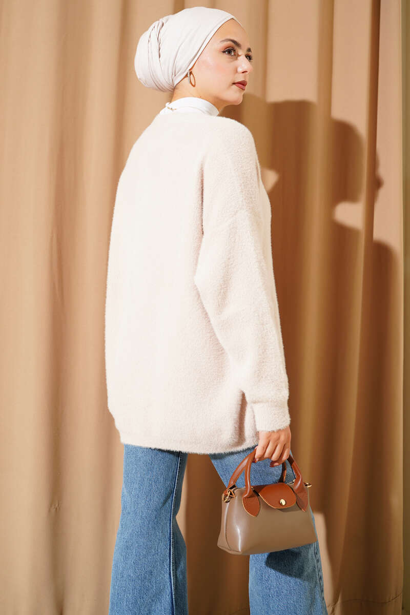 Düğmeli Cepli Uzun Triko Hırka Bej