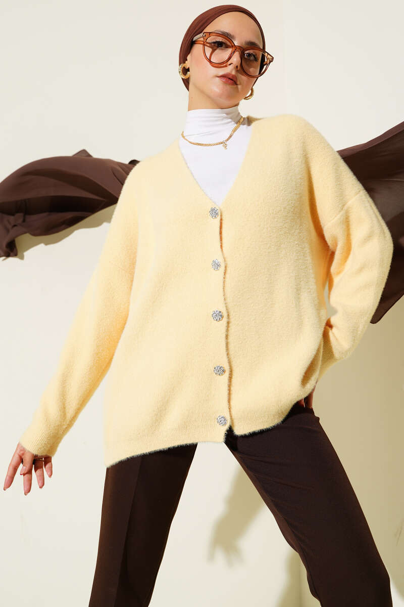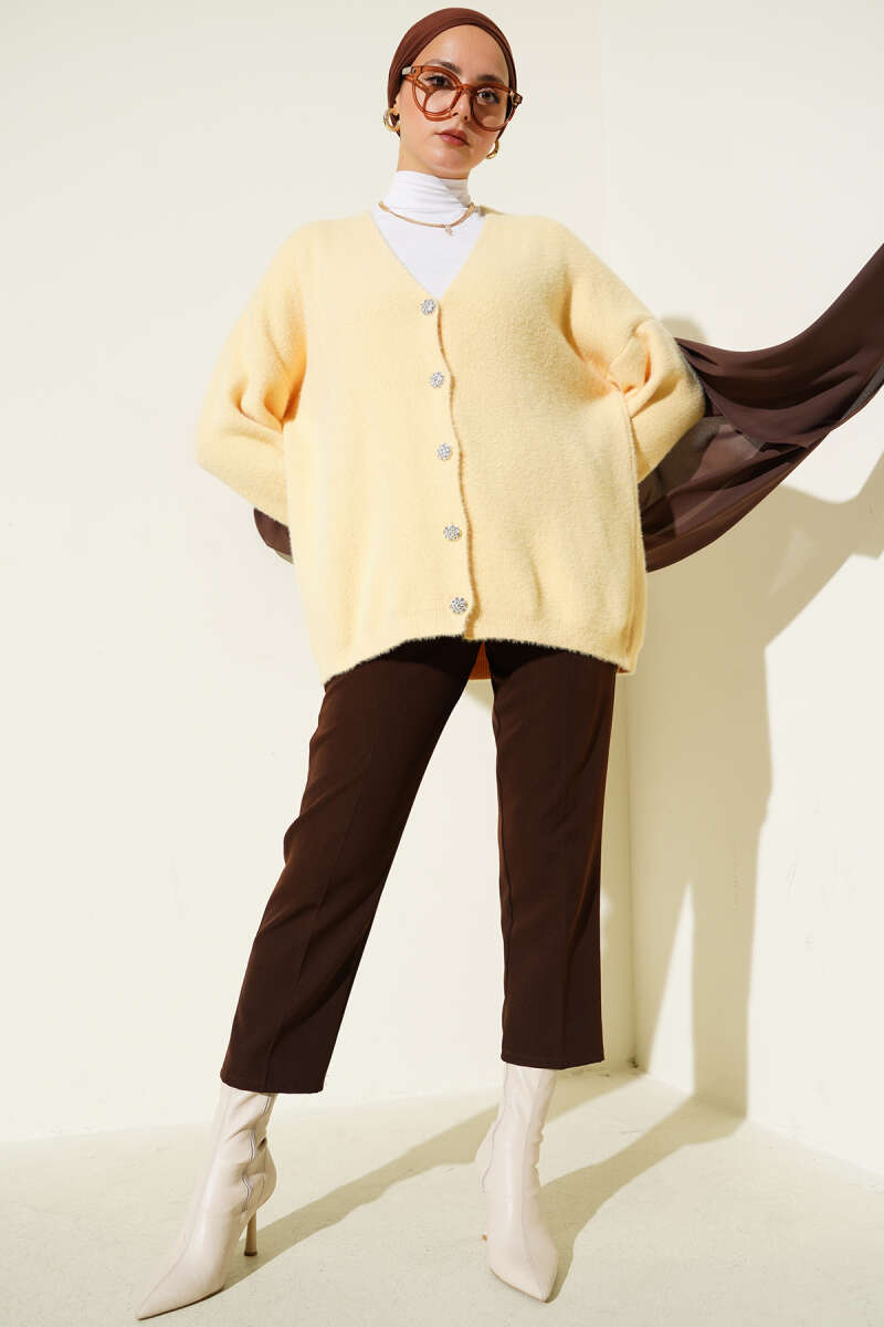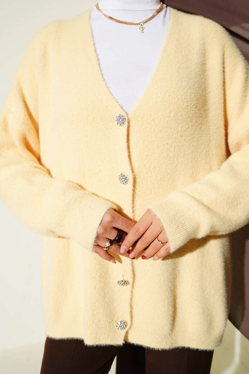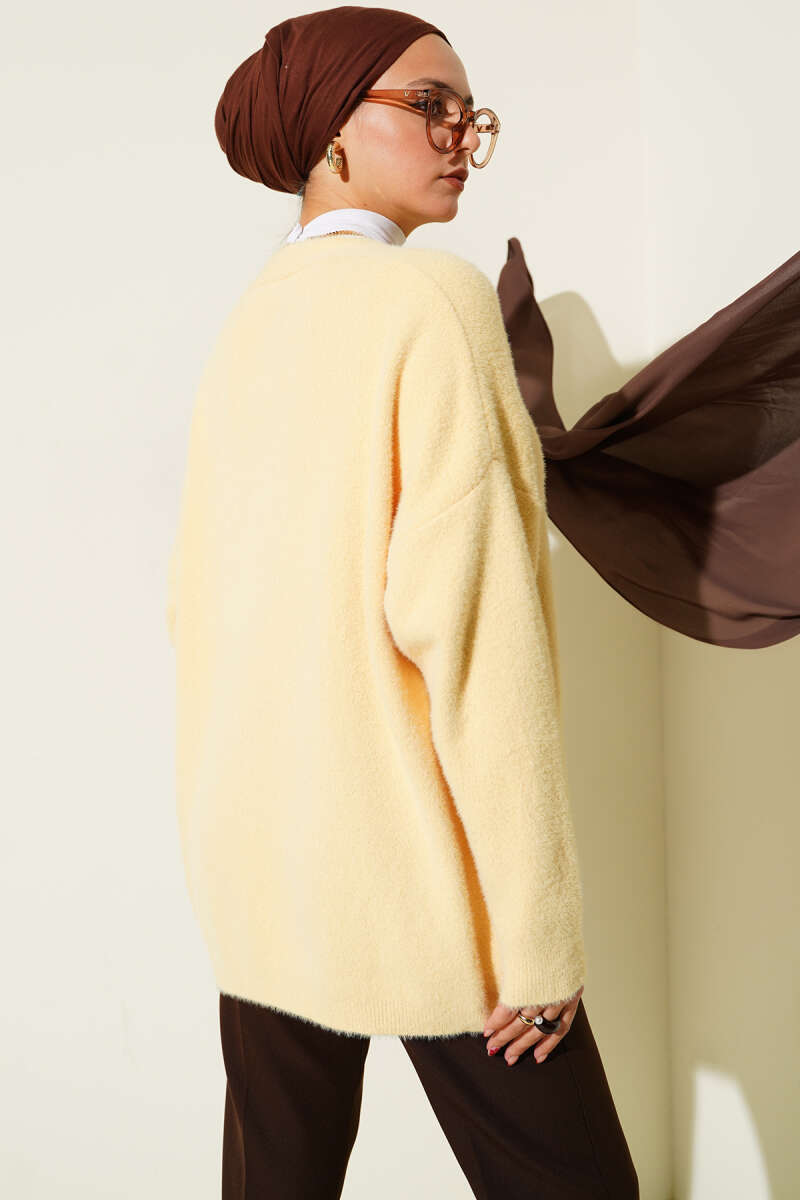 Düğmeli Cepli Uzun Triko Hırka Bej