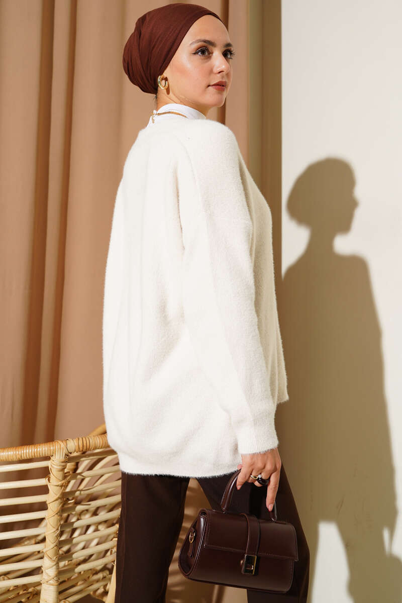 Sakallı Düğmeli Hırka Beyaz