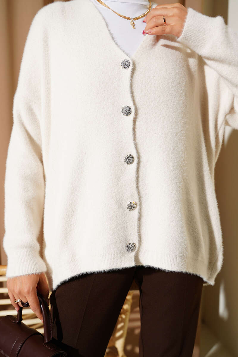 Sakallı Düğmeli Hırka Krem