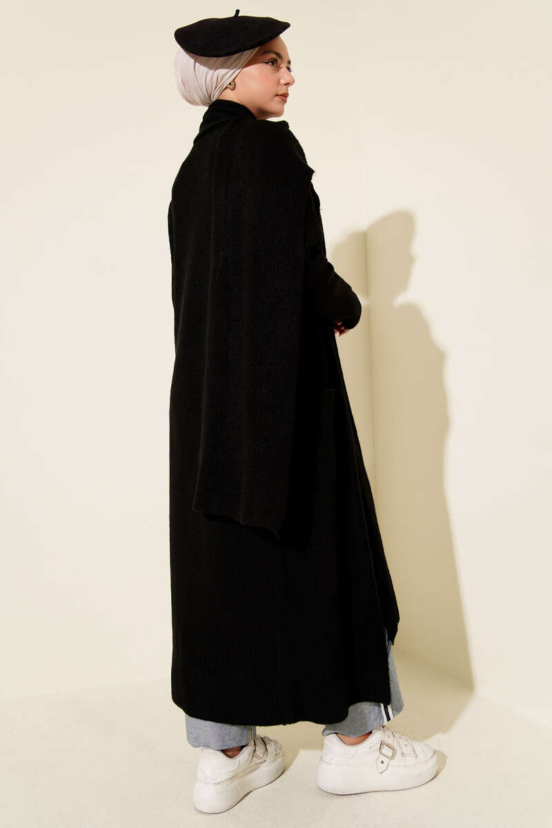 Cepli Örgü Desenli Uzun Hırka Siyah