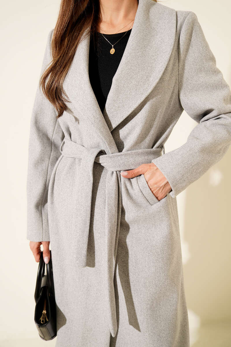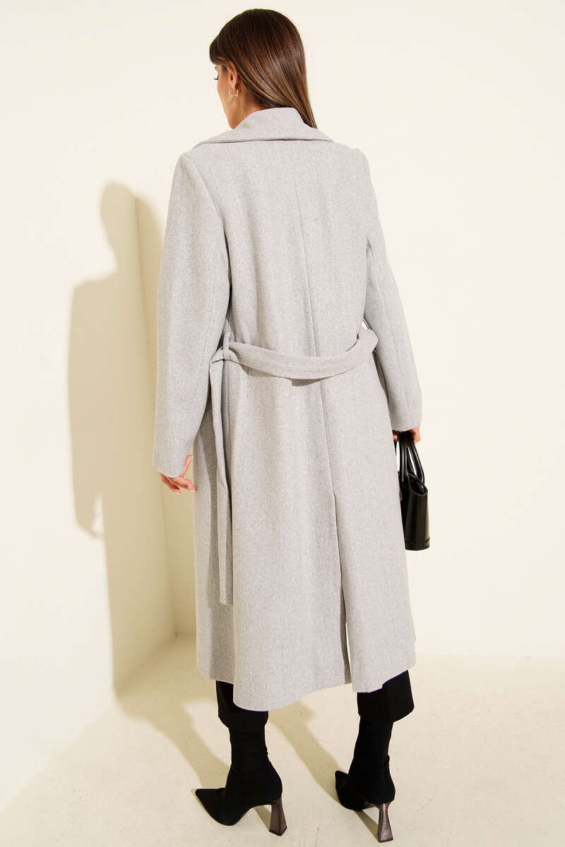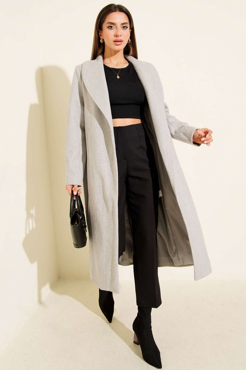 Kuşaklı Rüzgarlıklı Uzun Kaşe Kaban Gri