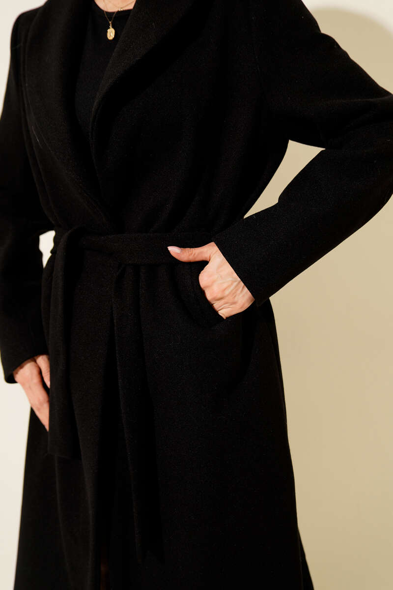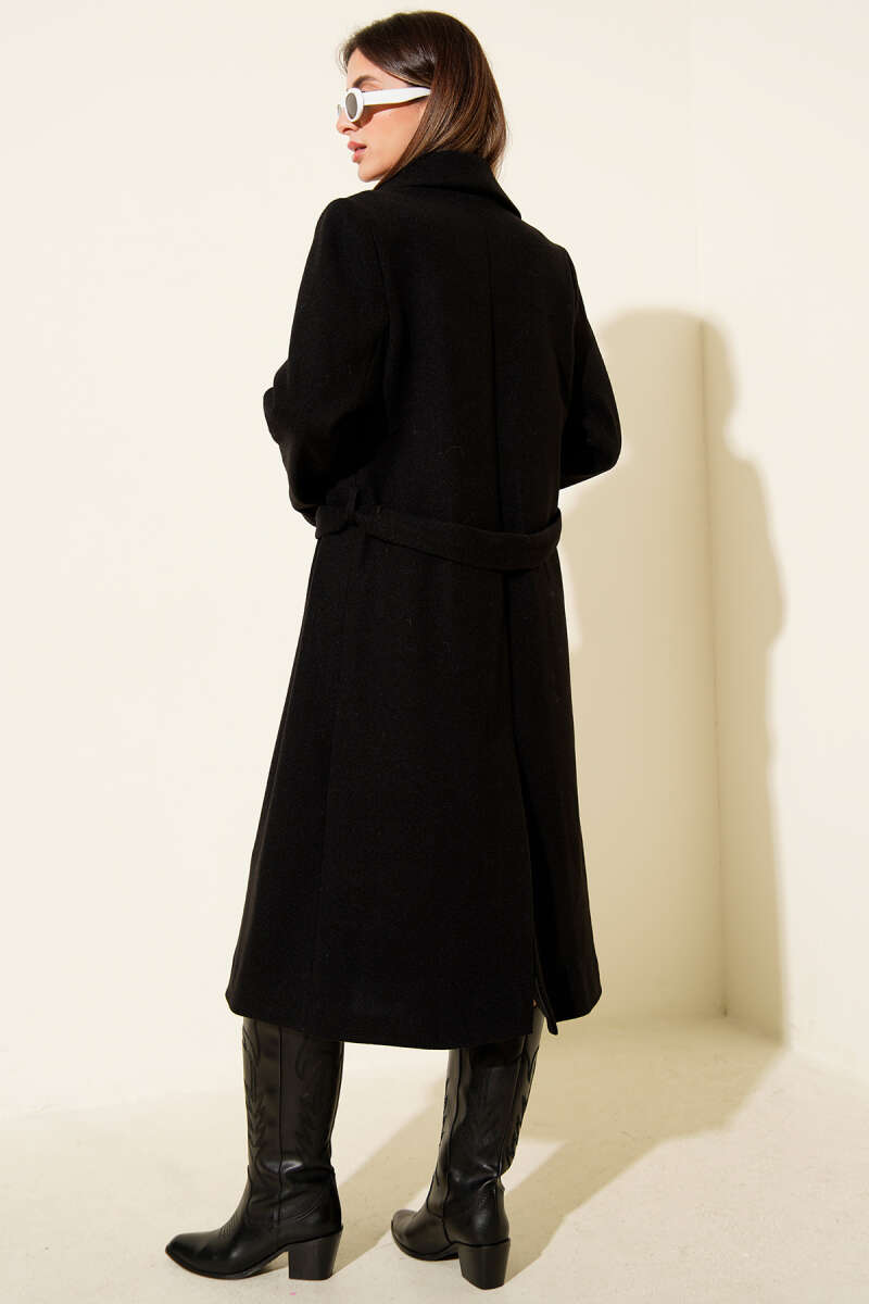 Kuşaklı Rüzgarlıklı Uzun Kaşe Kaban Siyah