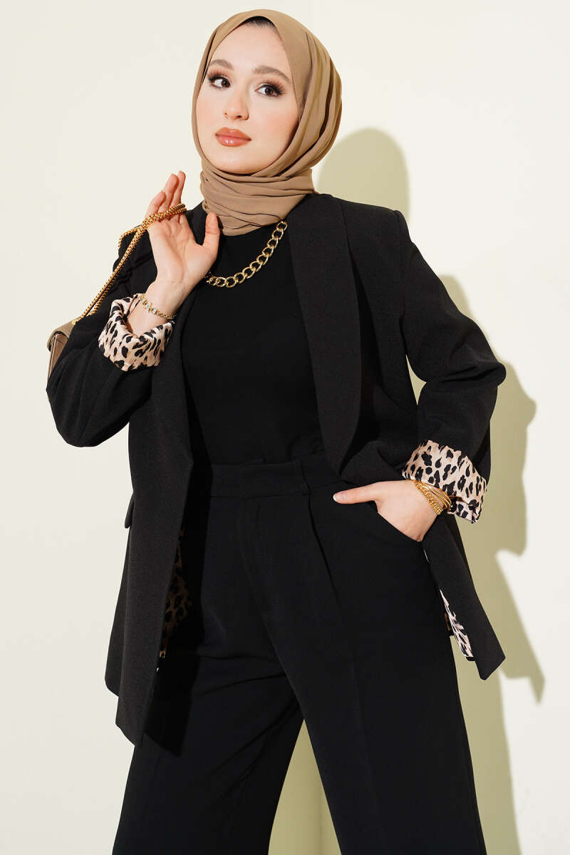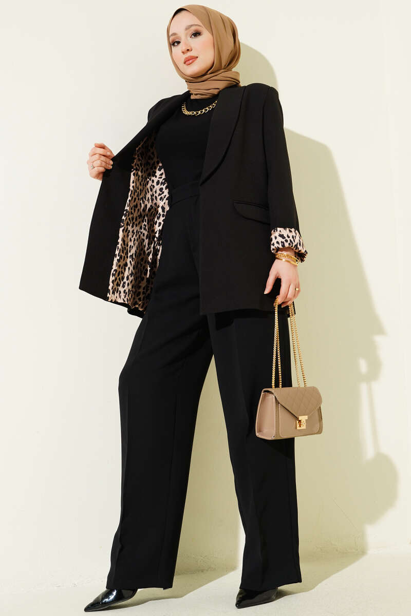 Şal Yaka Leopar Astarlı Blazer Ceket Siyah
