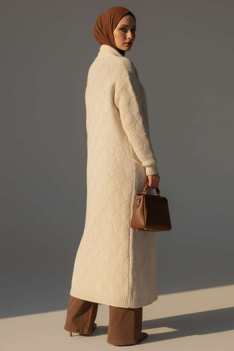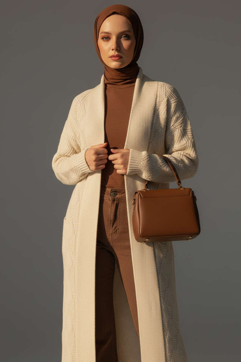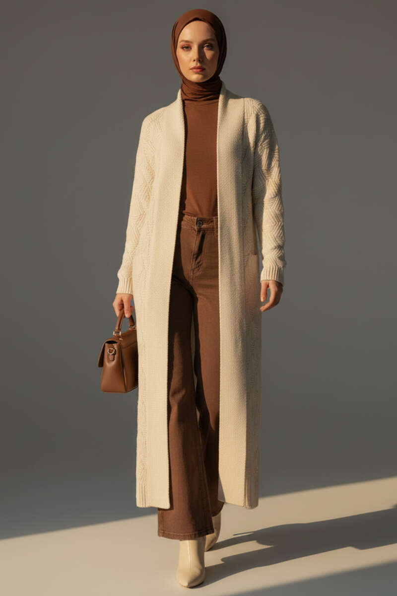 Cepli Örgü Desenli Uzun Hırka Ekru