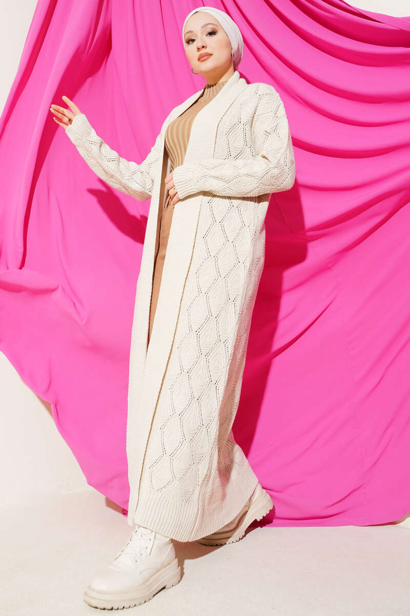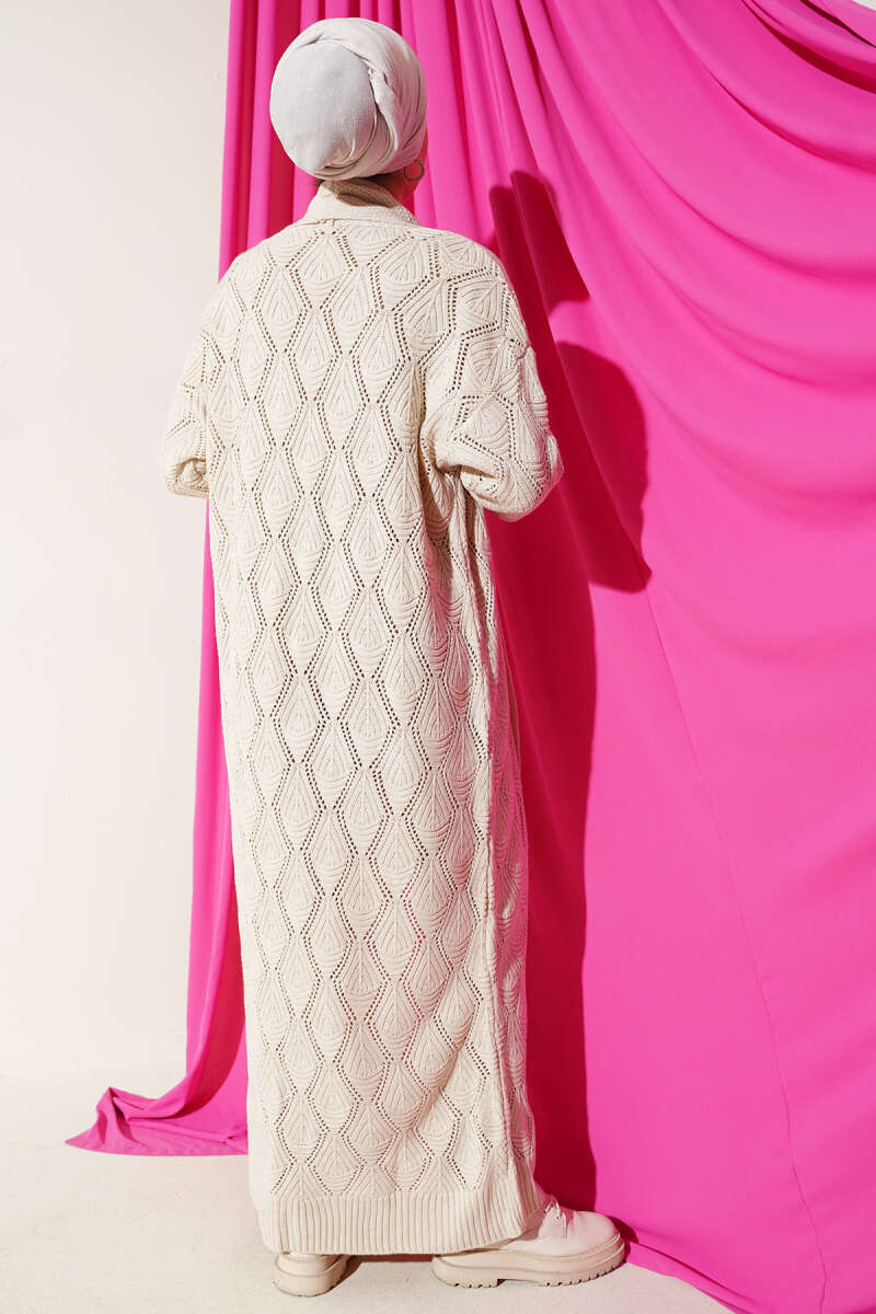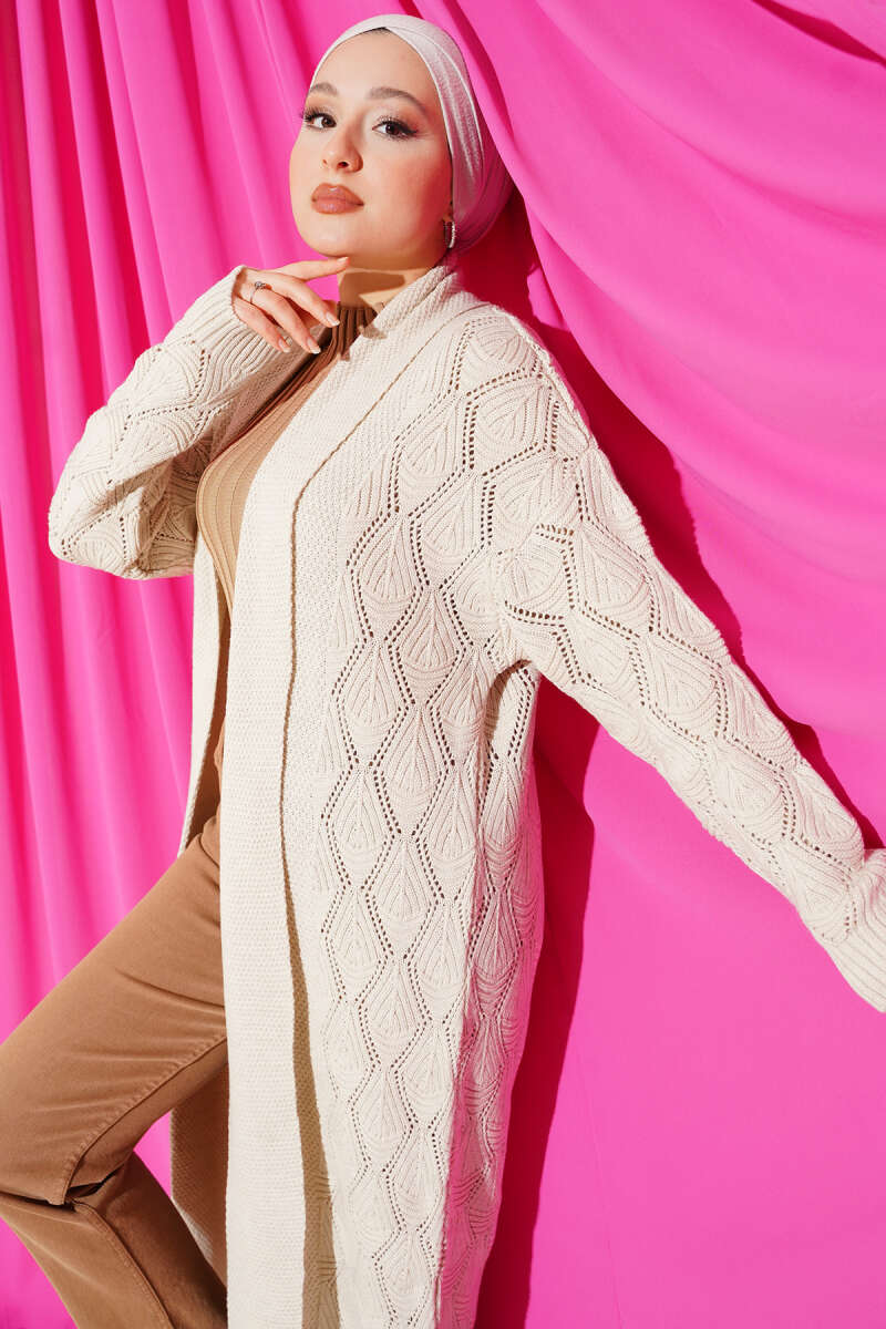 Şal Yaka Örgü Desenli Uzun Triko Hırka Bej