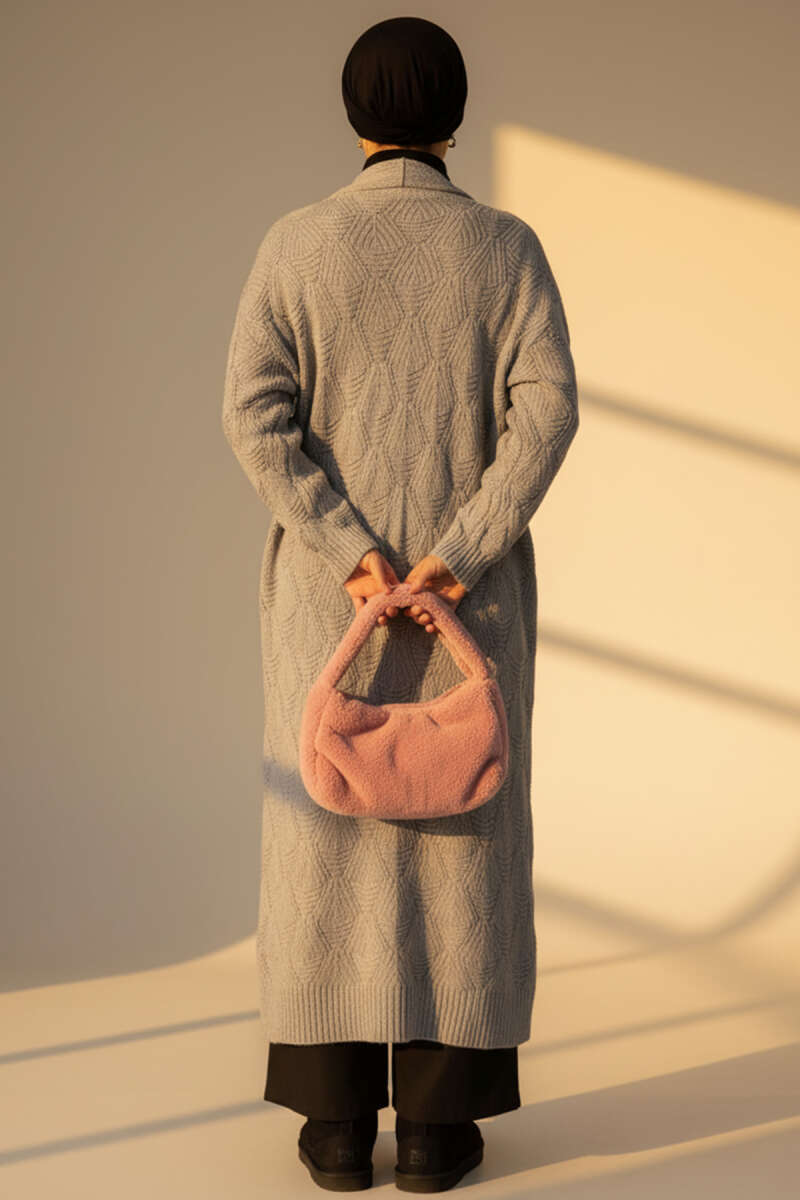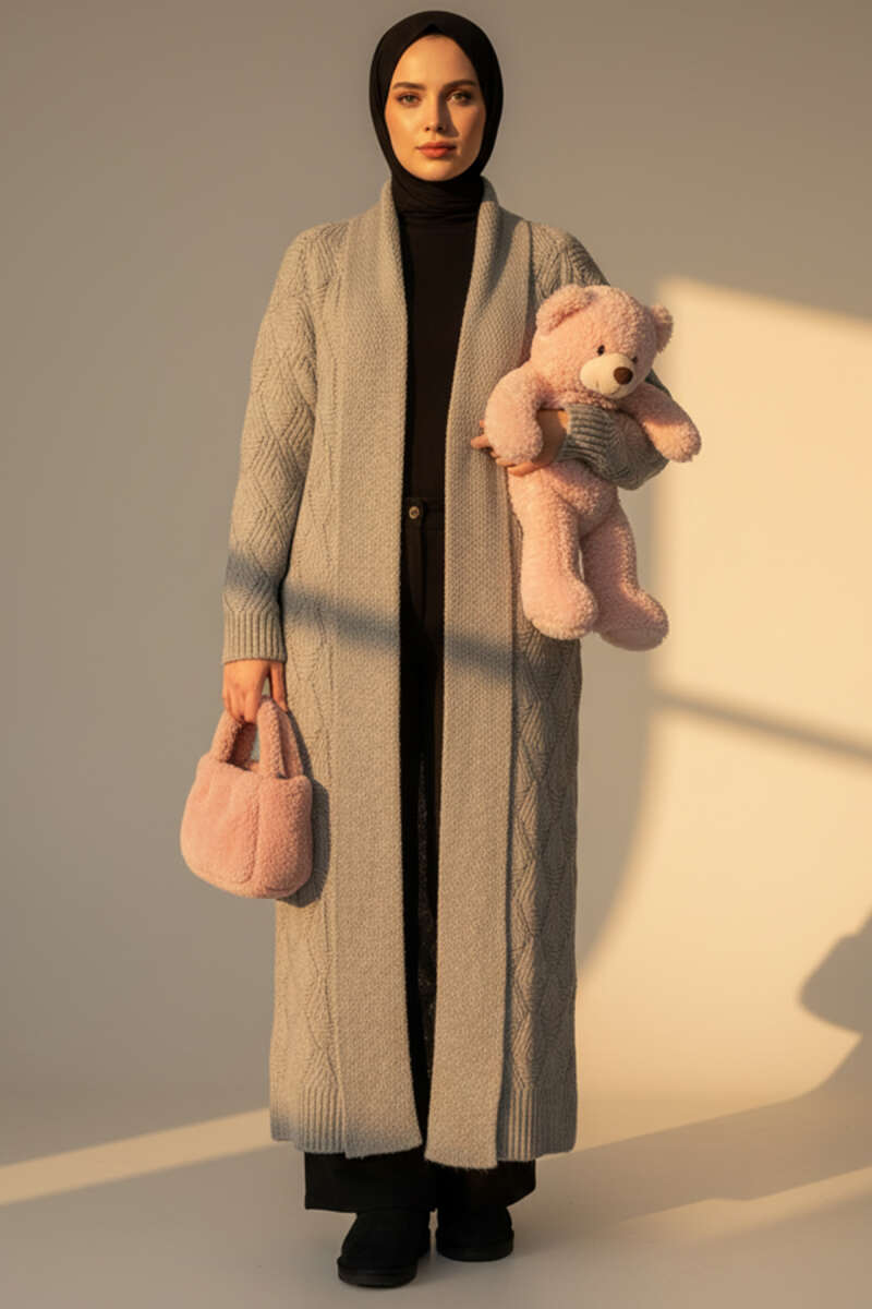 Şal Yaka Örgü Desenli Uzun Triko Hırka Gri
