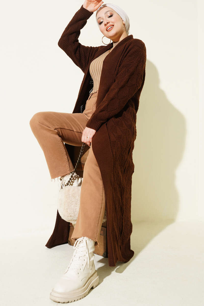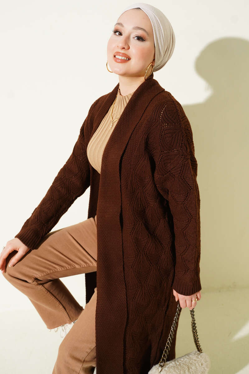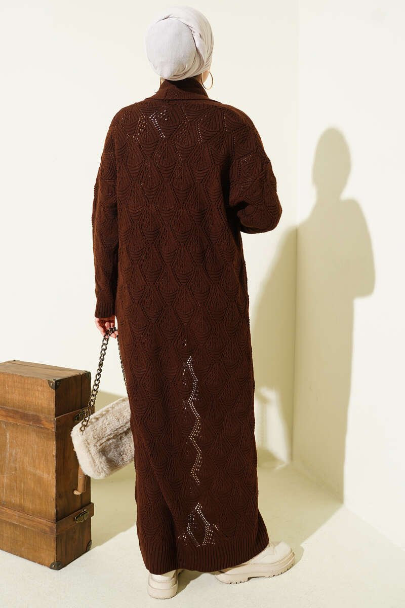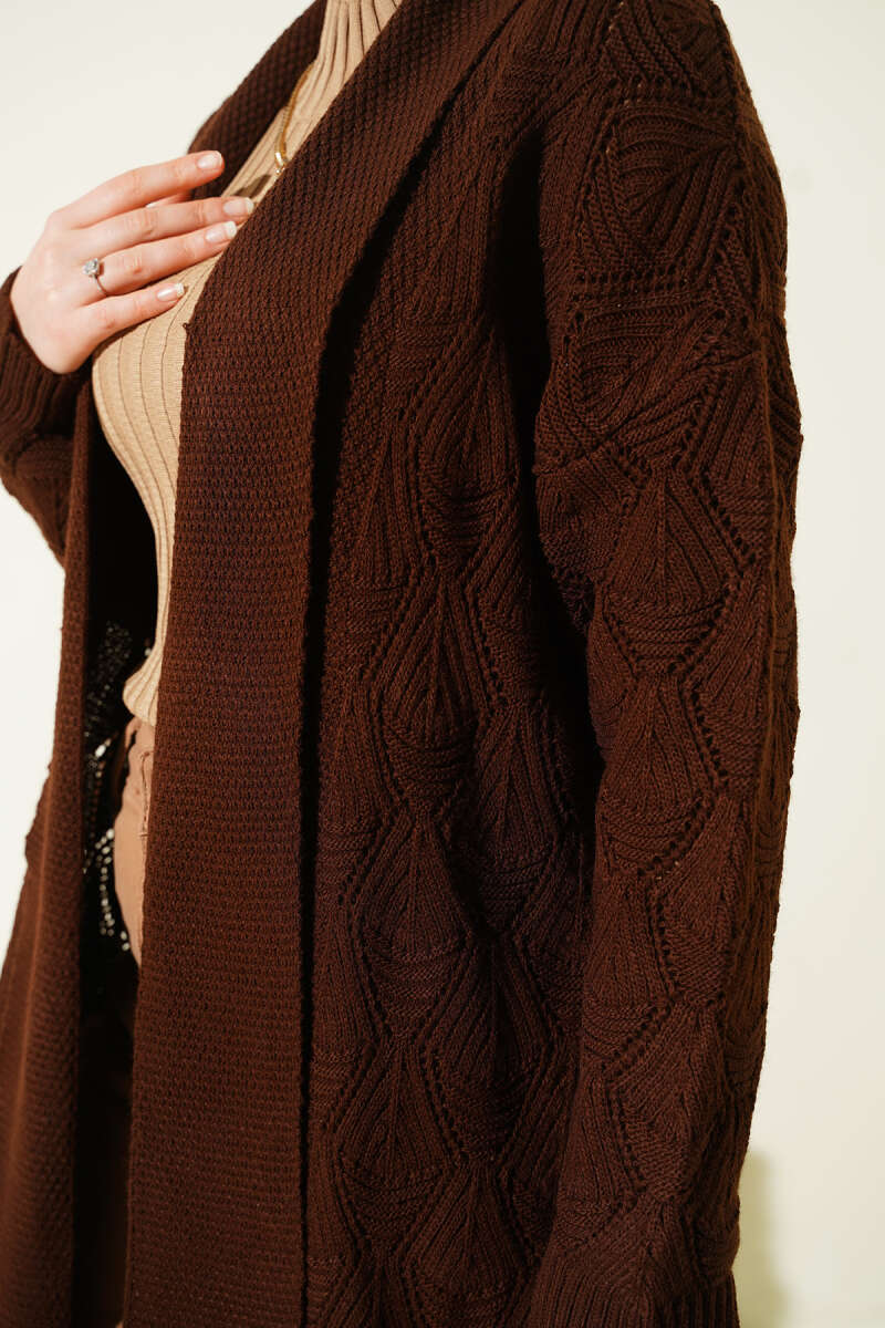 Şal Yaka Örgü Desenli Uzun Triko Hırka Kahve