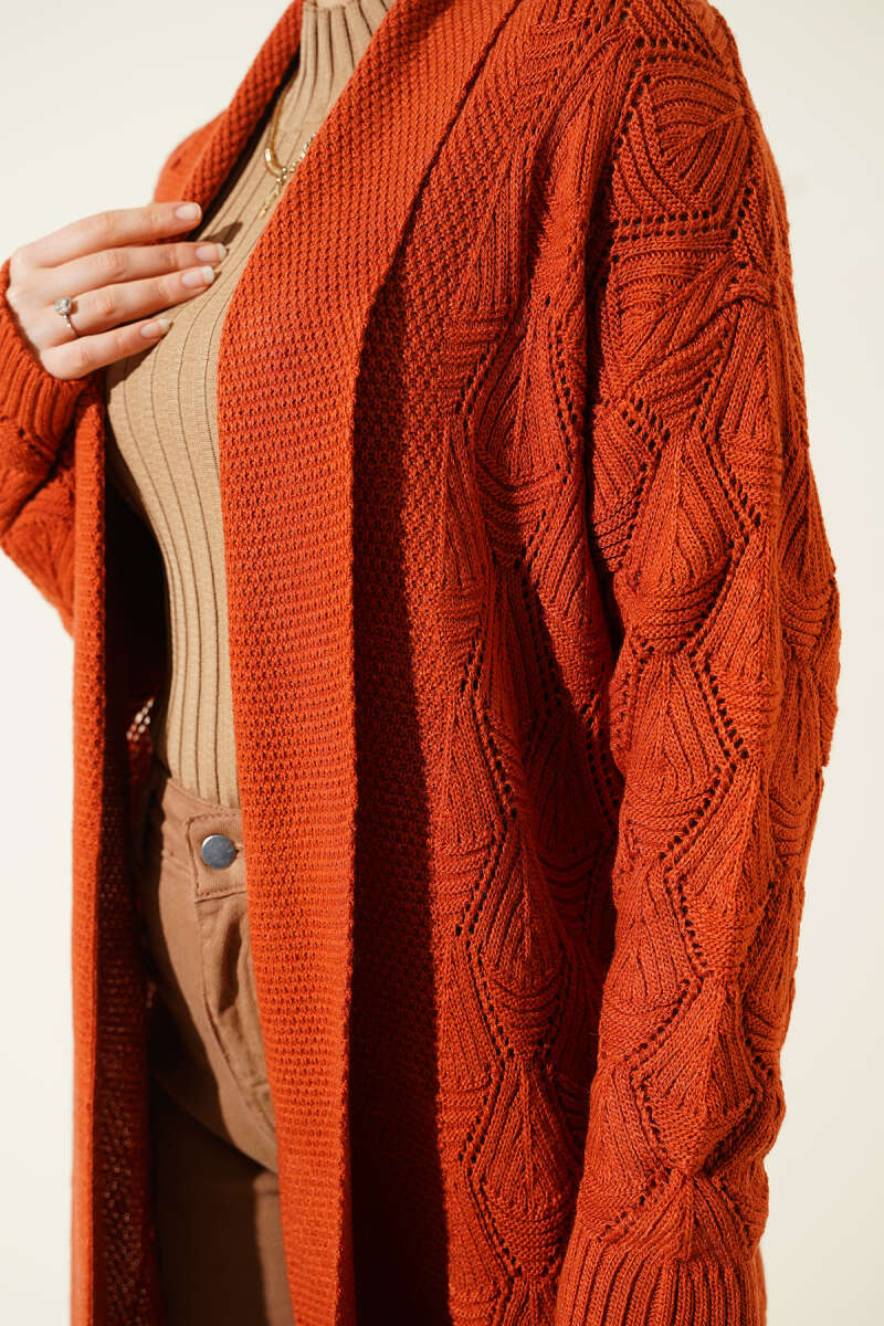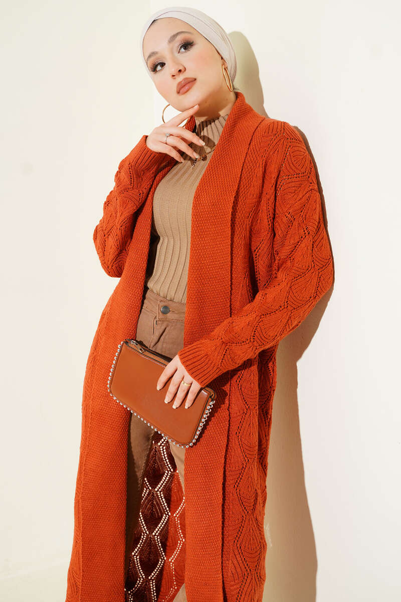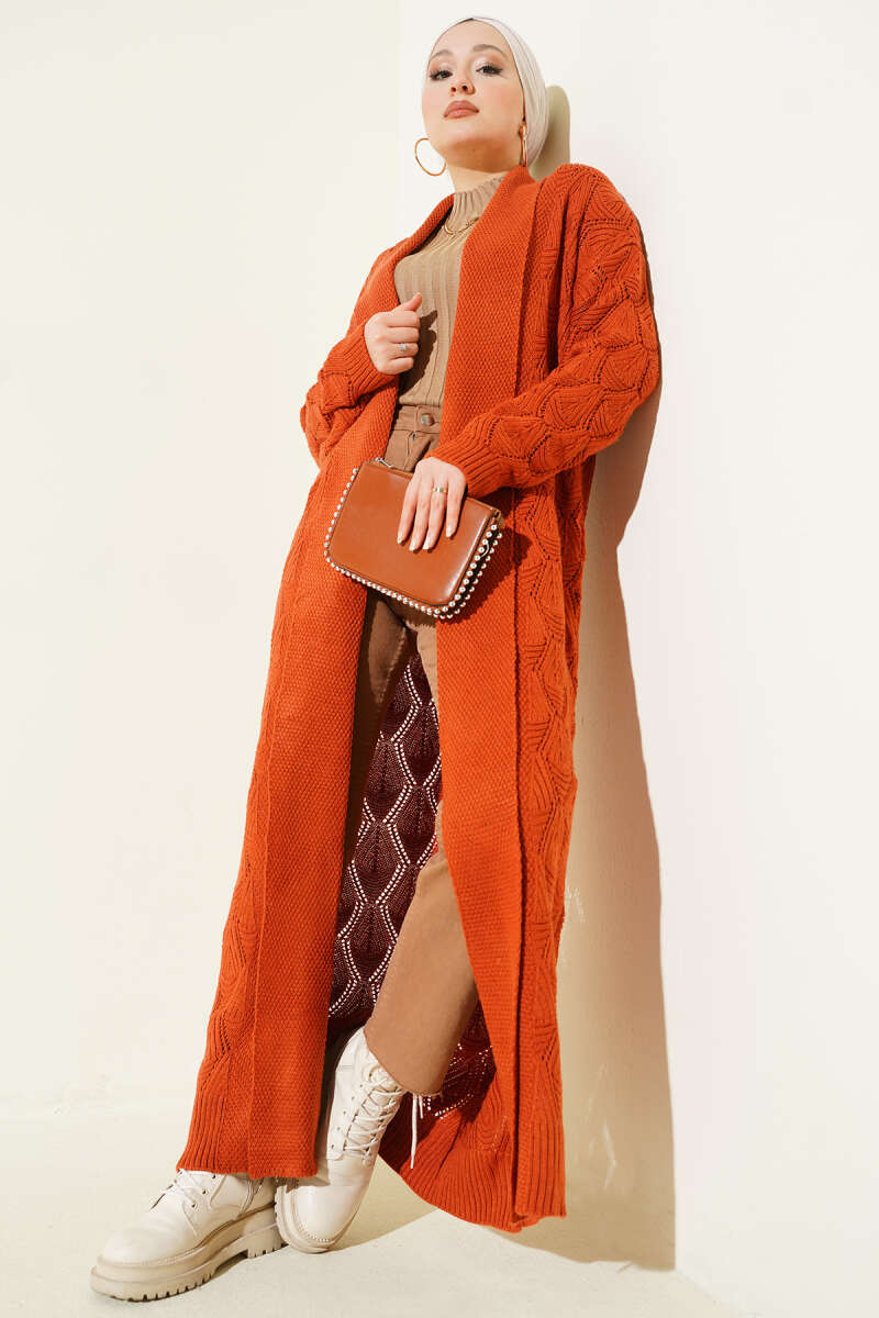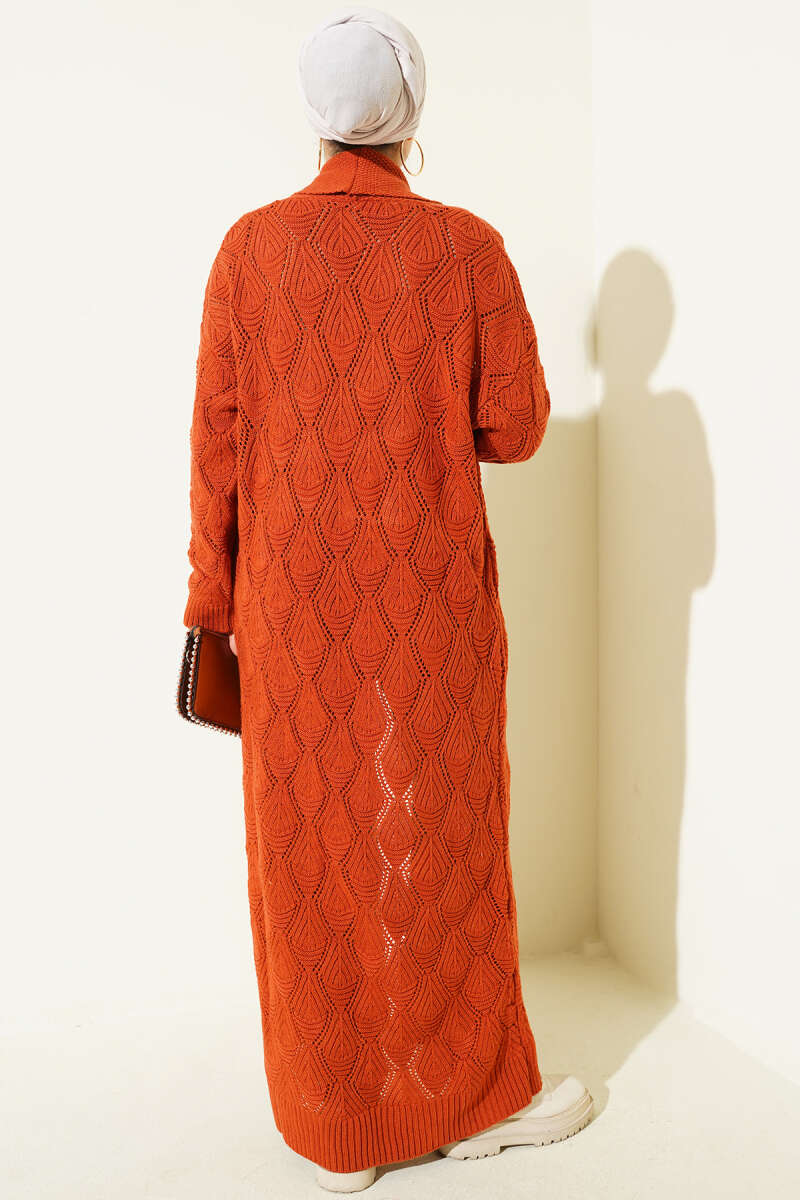 Şal Yaka Örgü Desenli Uzun Triko Hırka Kiremit
