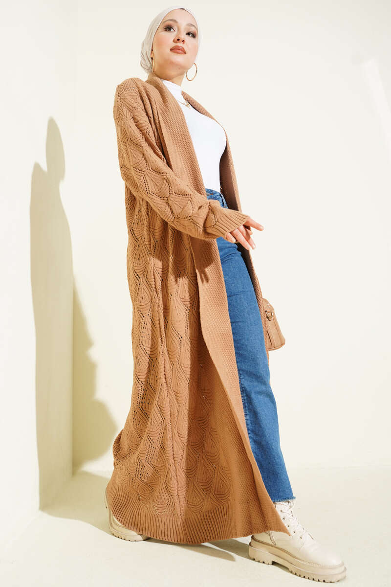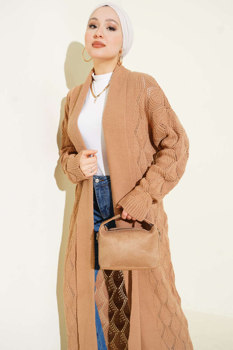 Örgü Desen Detaylı Triko Hırka Acı Kahve