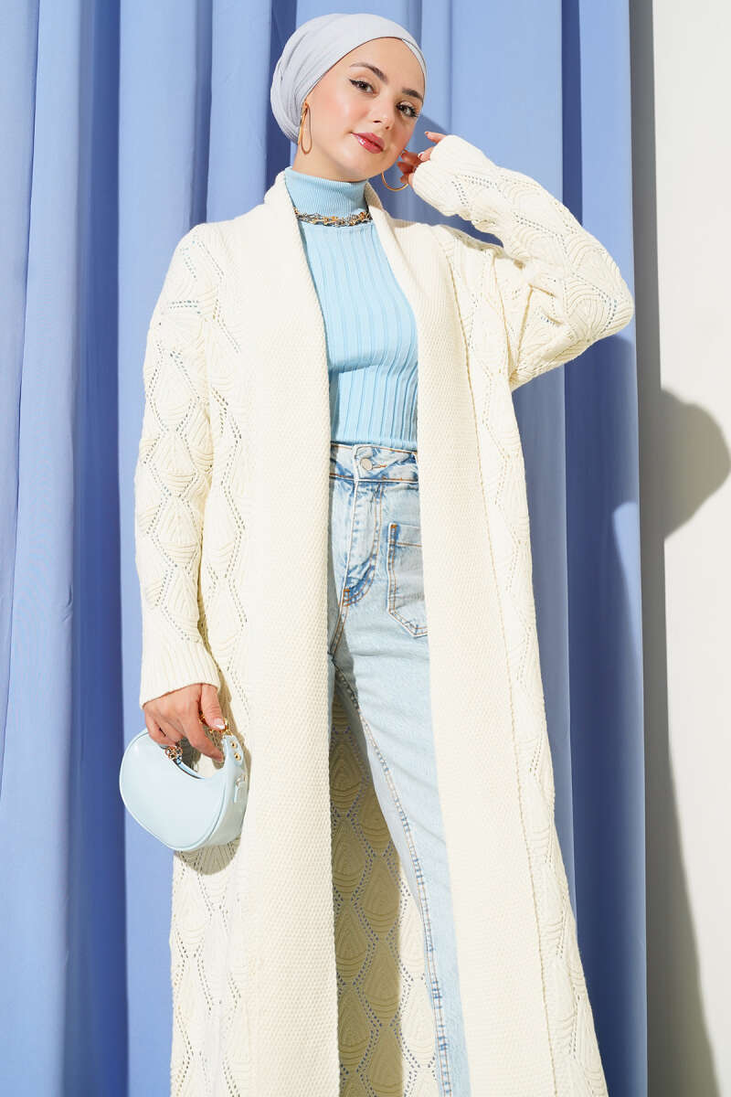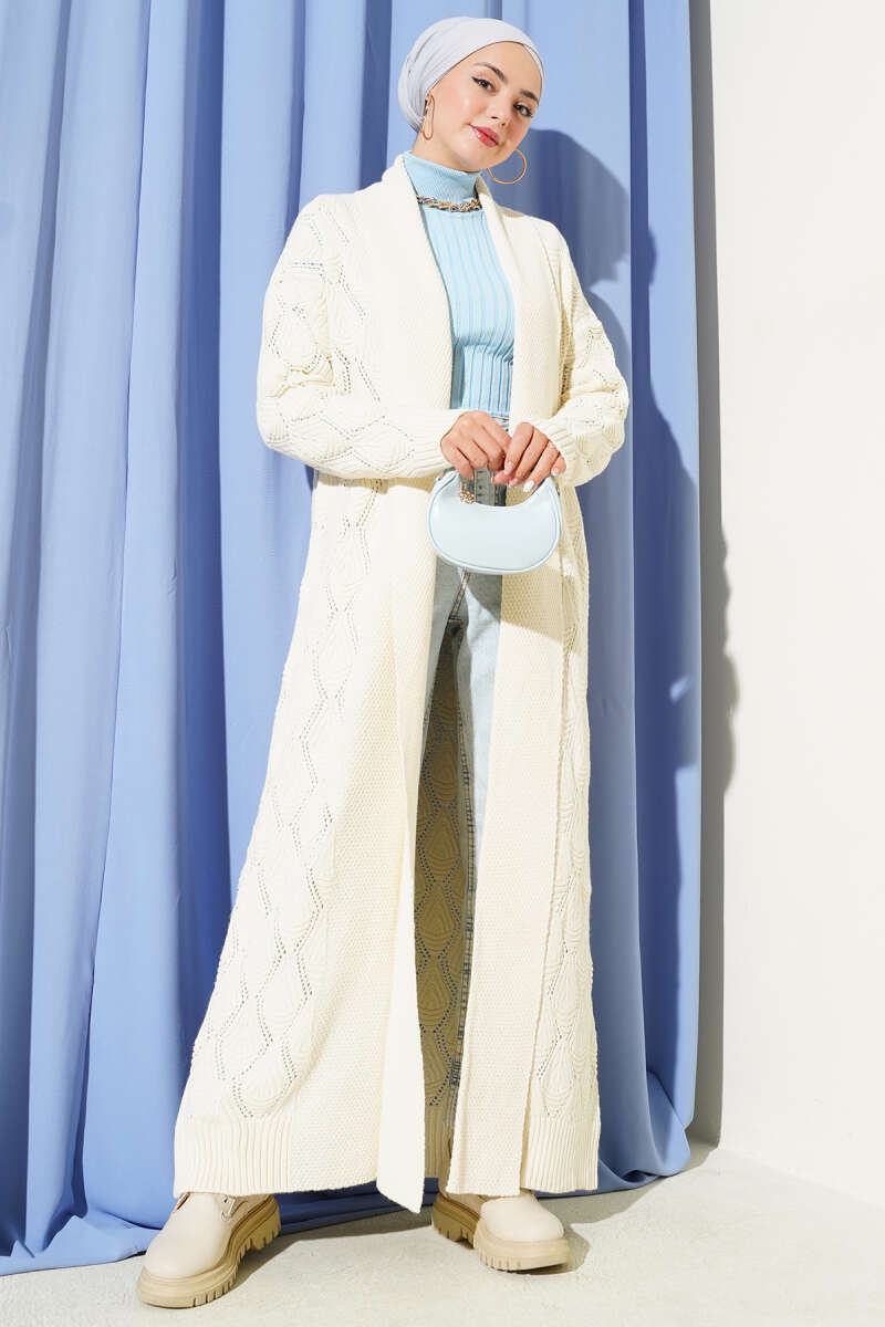 Saç Örgülü Düğmeli Triko Hırka Bej
