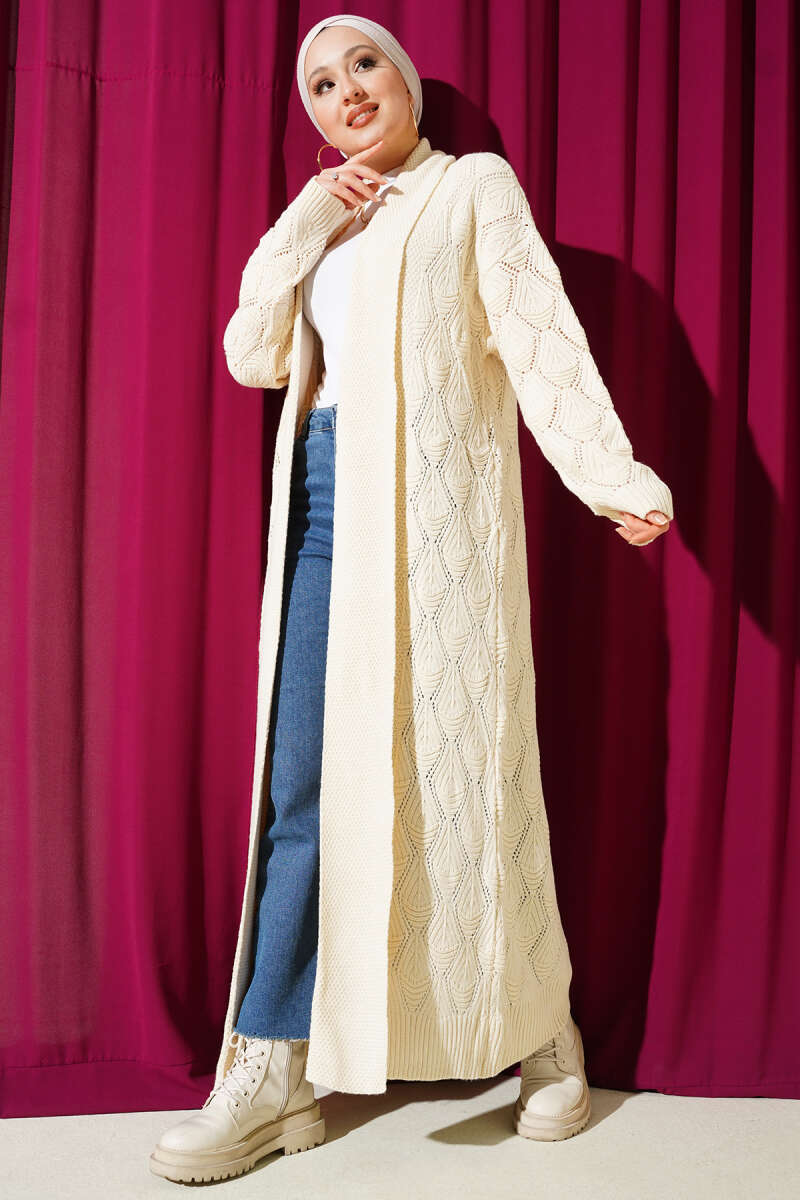 Şal Yaka Örgü Desenli Uzun Triko Hırka Taş