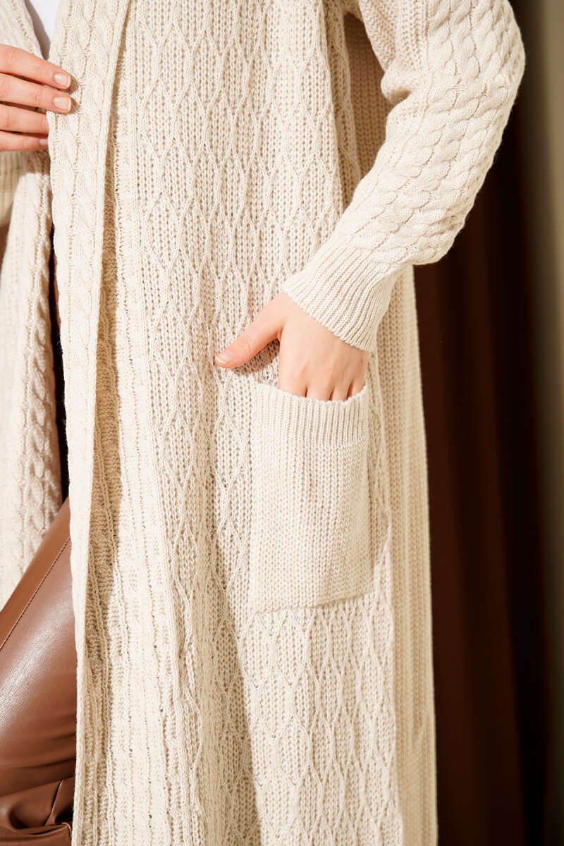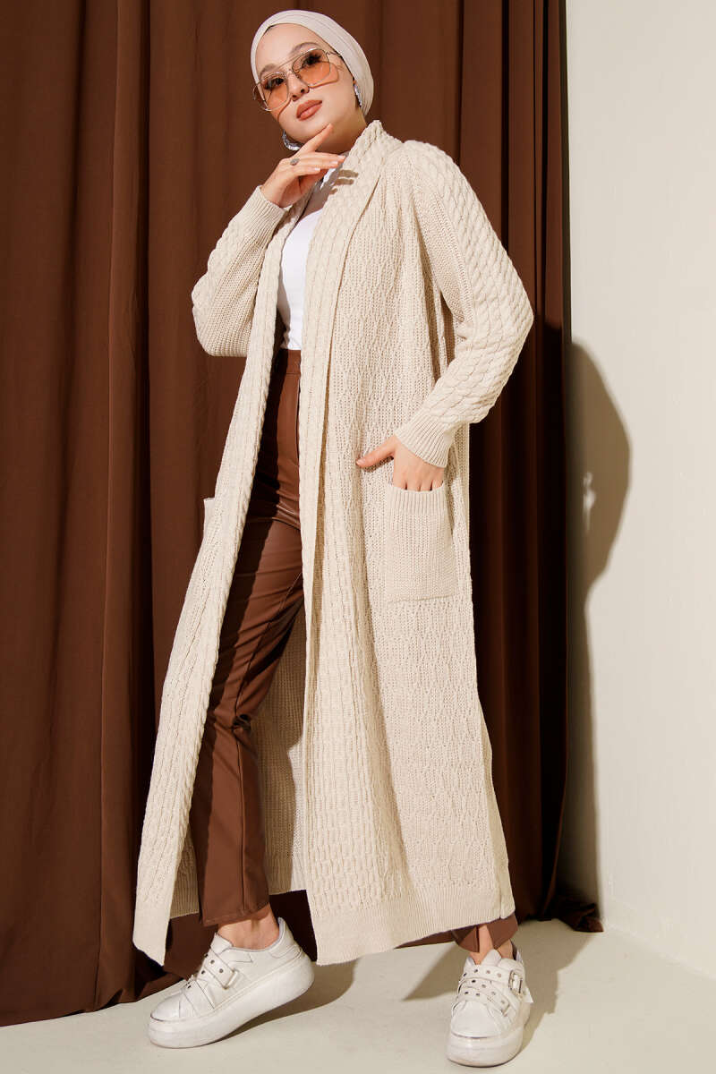 Şal Yaka Örgü Kabartmalı Triko Hırka Latte