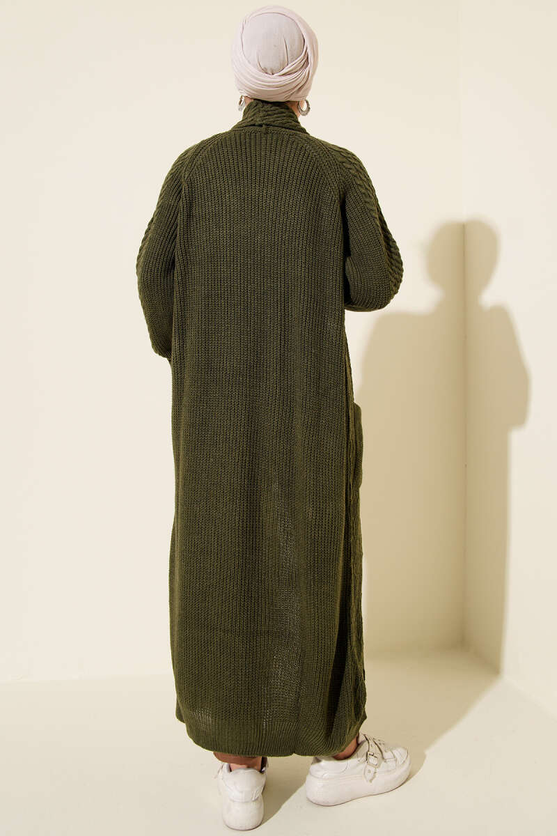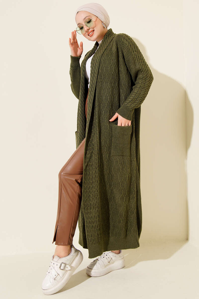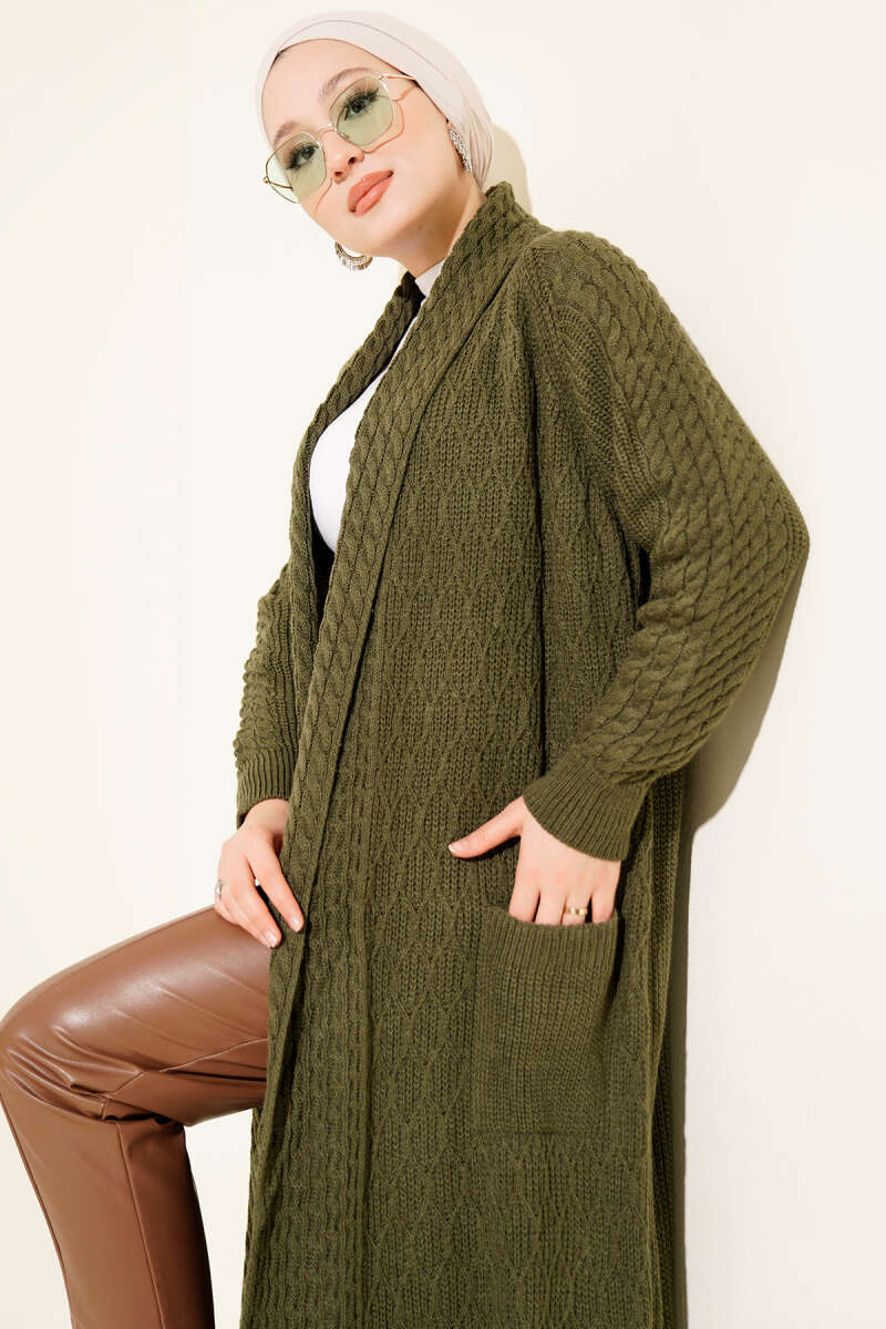 Şal Yaka Örgü Kabartmalı Triko Hırka Yeşil