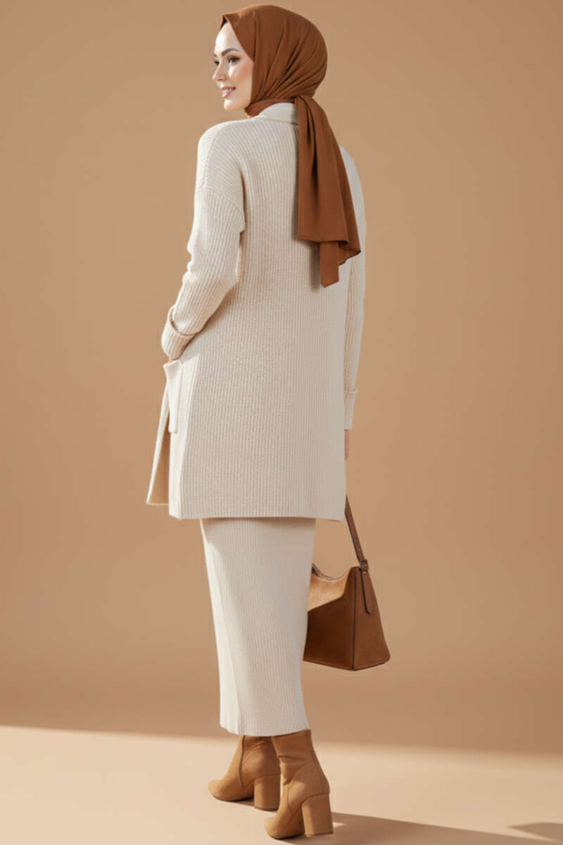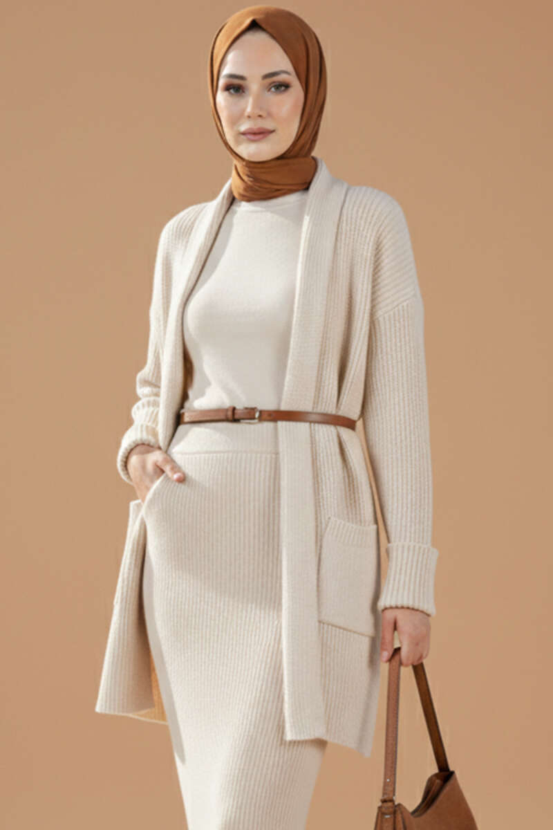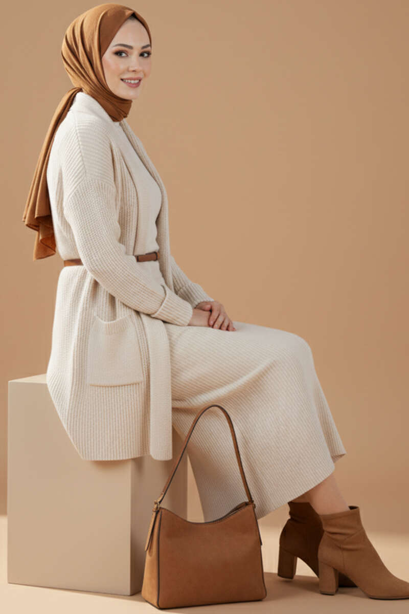 Düğmeli Cepli Uzun Triko Hırka Bej