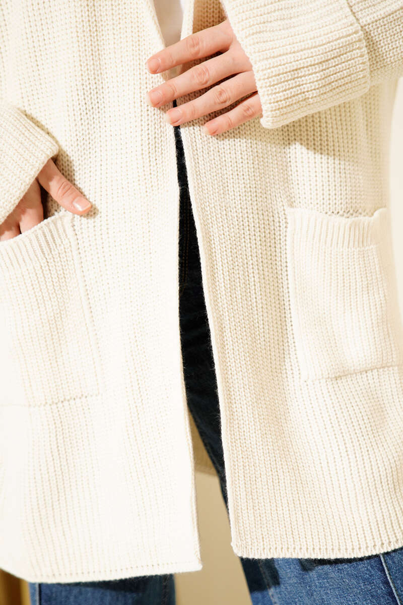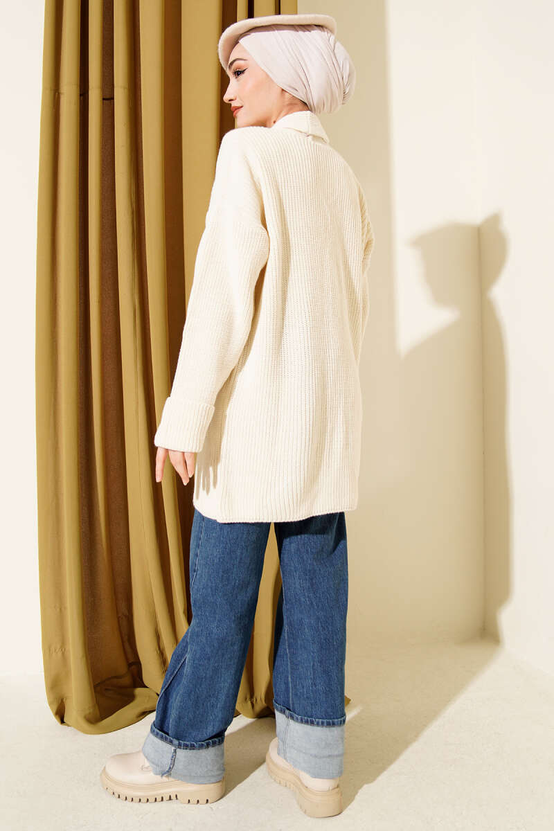 Kol Ucu Düğmeli Şal Yaka Triko Hırka Krem