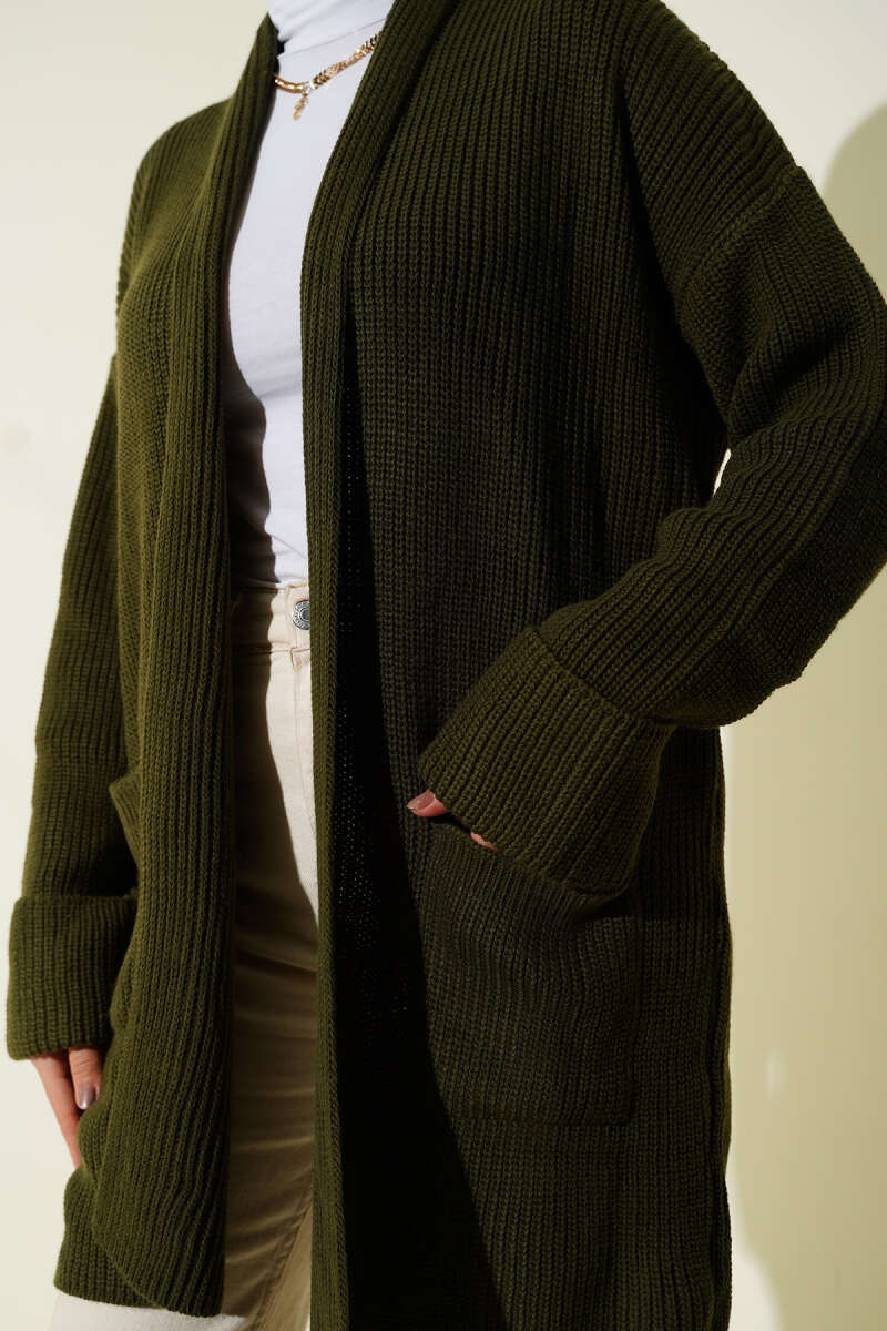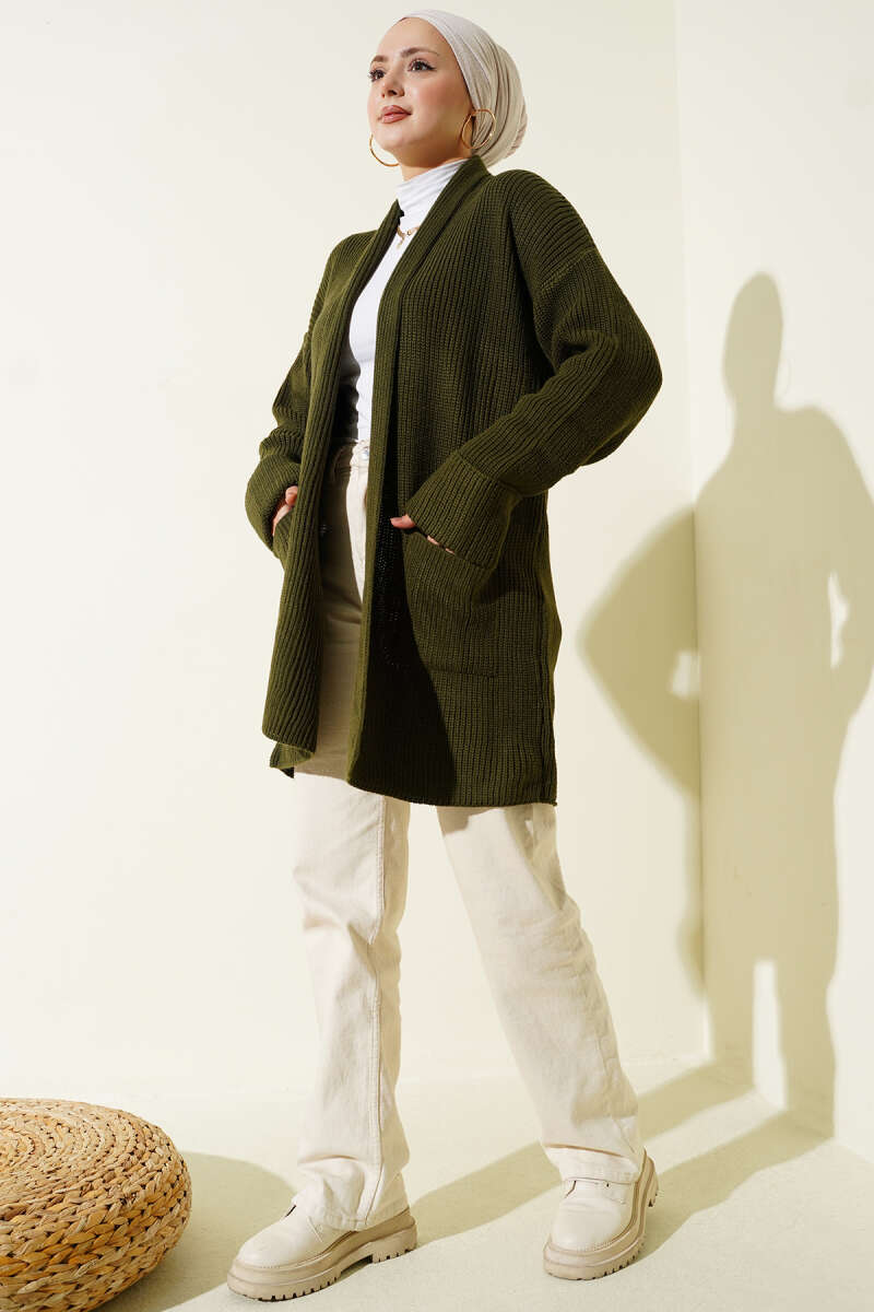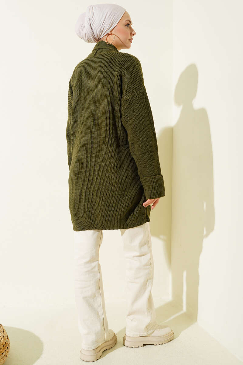 Çift Cepli Düğmeli Triko Hırka Yağ Yeşili