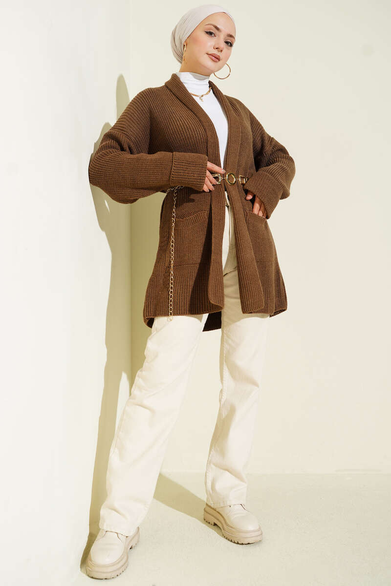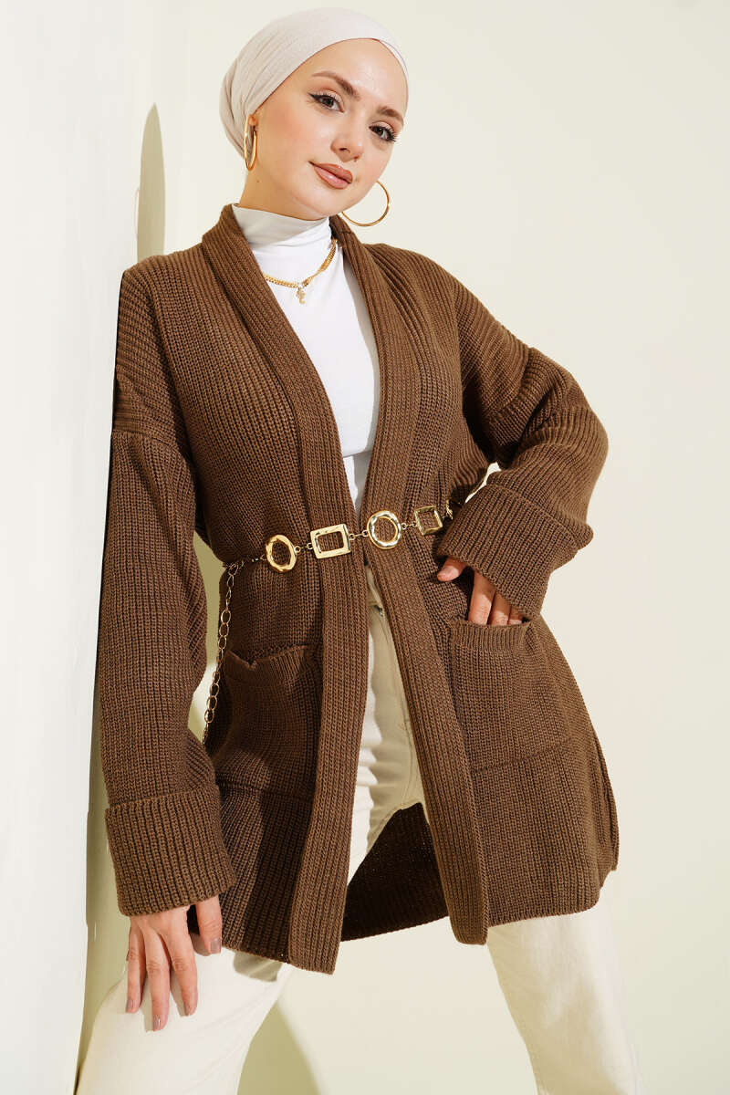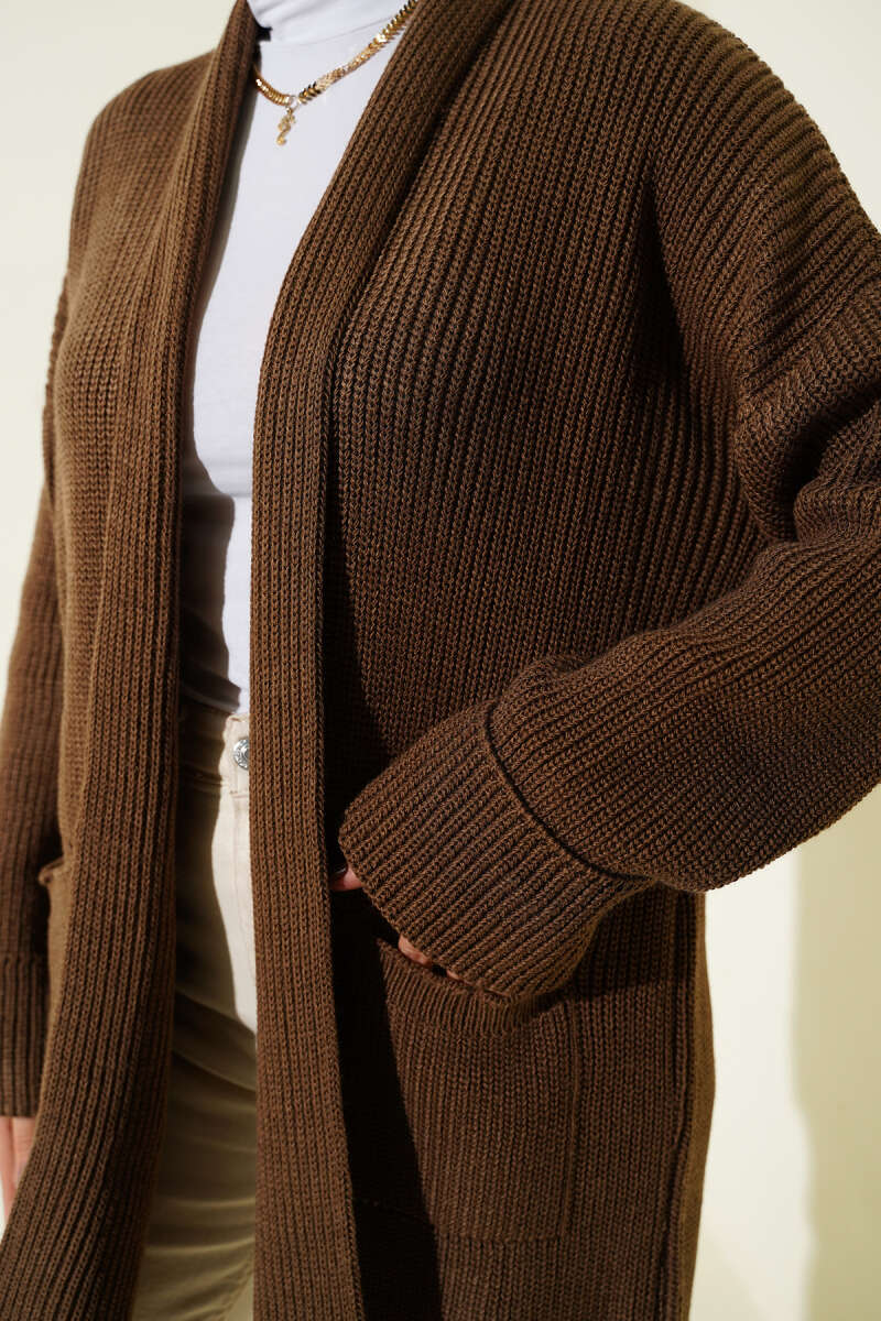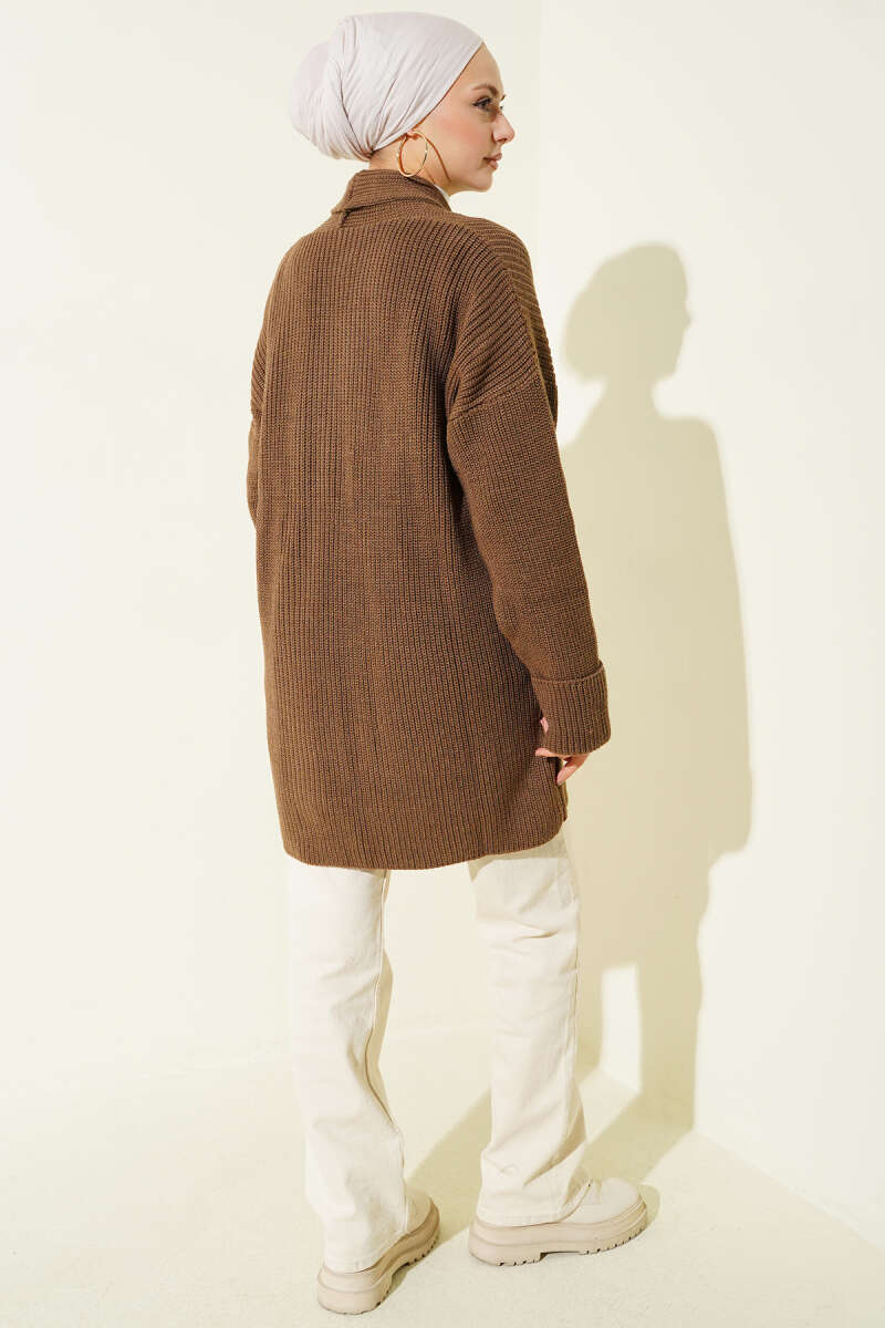 Çizgili Düğme Detaylı Kısa Triko Hırka Kahve