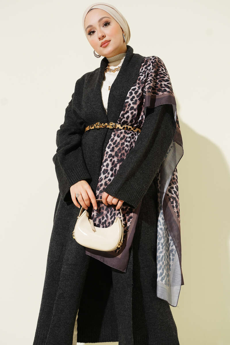 Desenli Düğme Detaylı Triko Hırka Füme