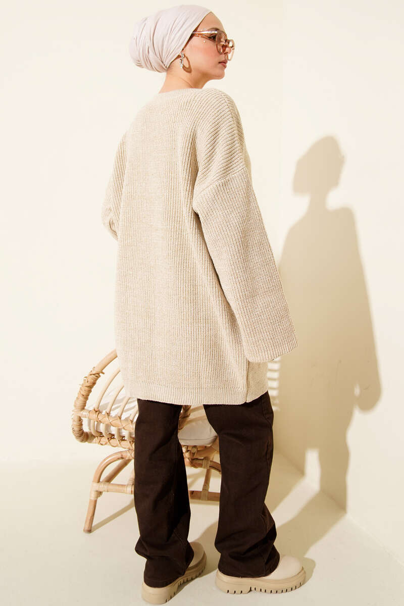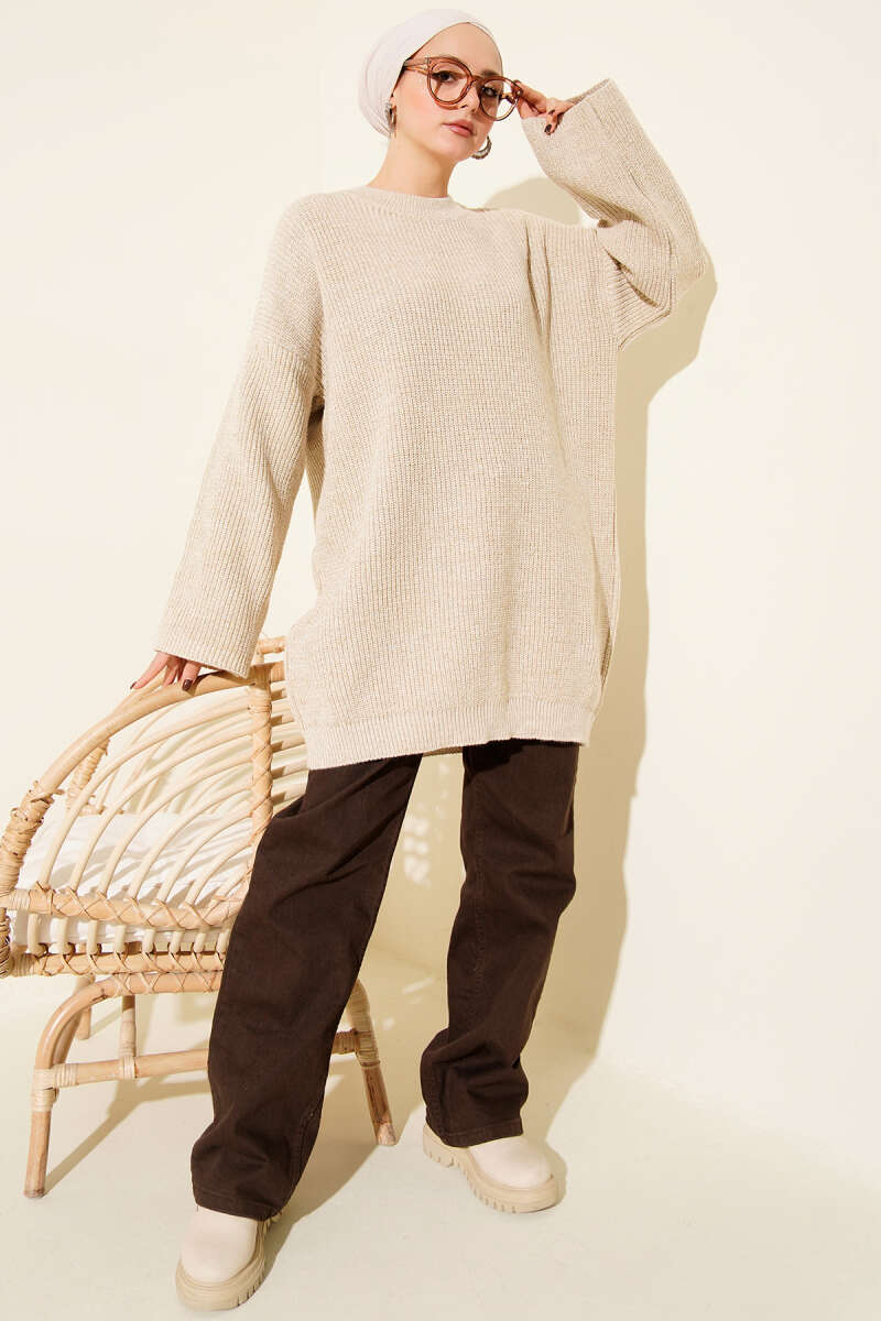 Basic Bisiklet Yaka Düz Triko Tunik Ekru