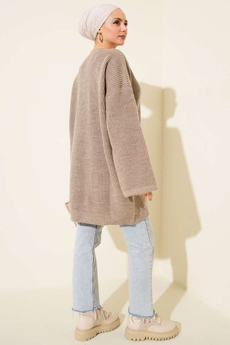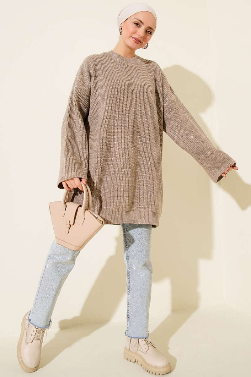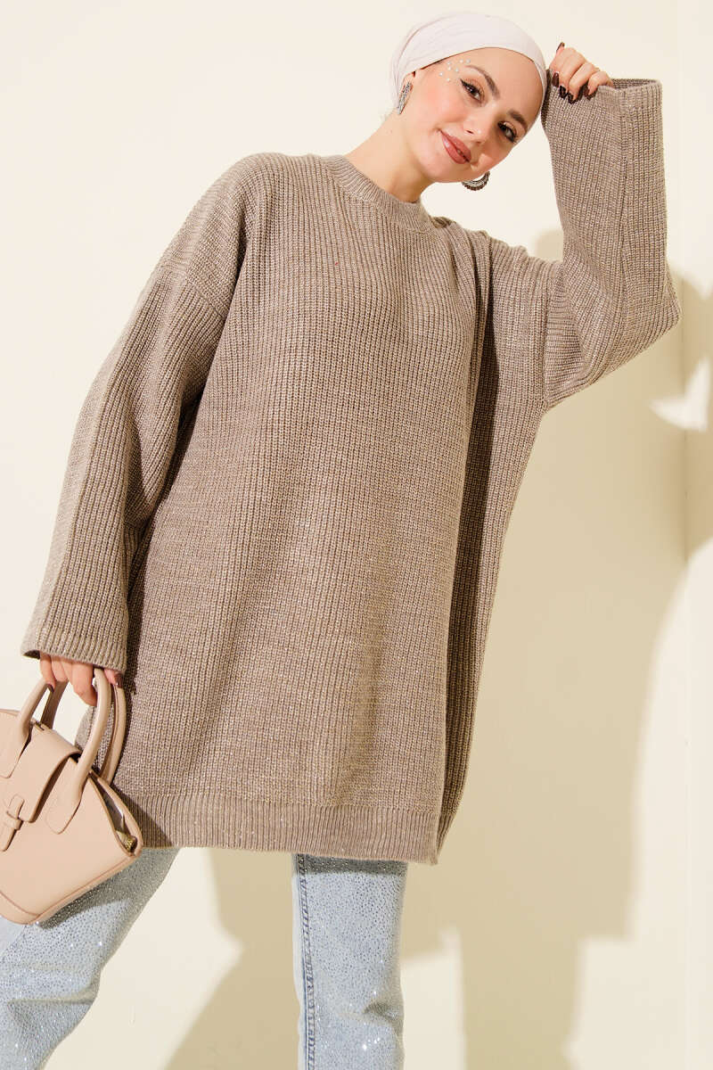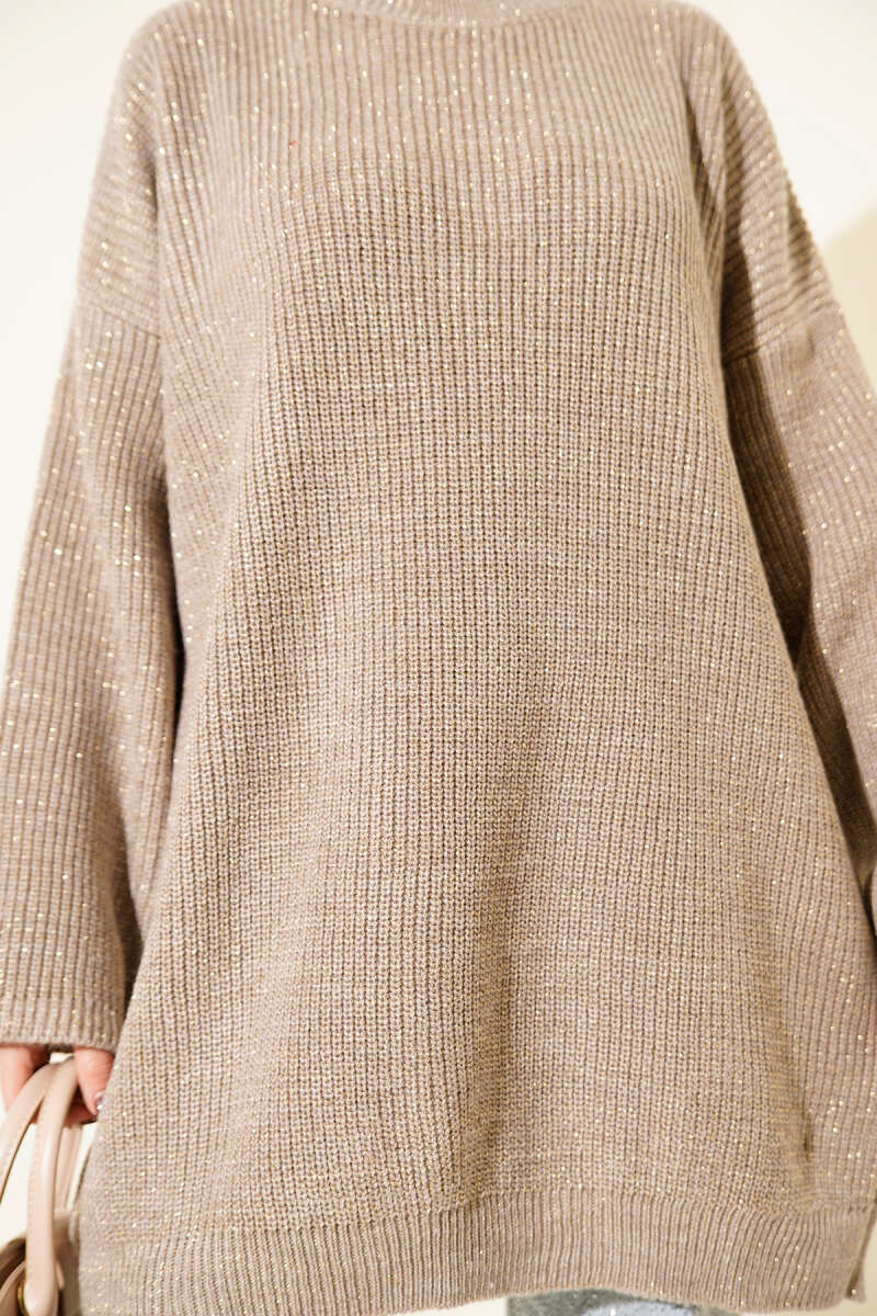 Salaş Bisiklet Yaka Simli Triko Tunik Kahve