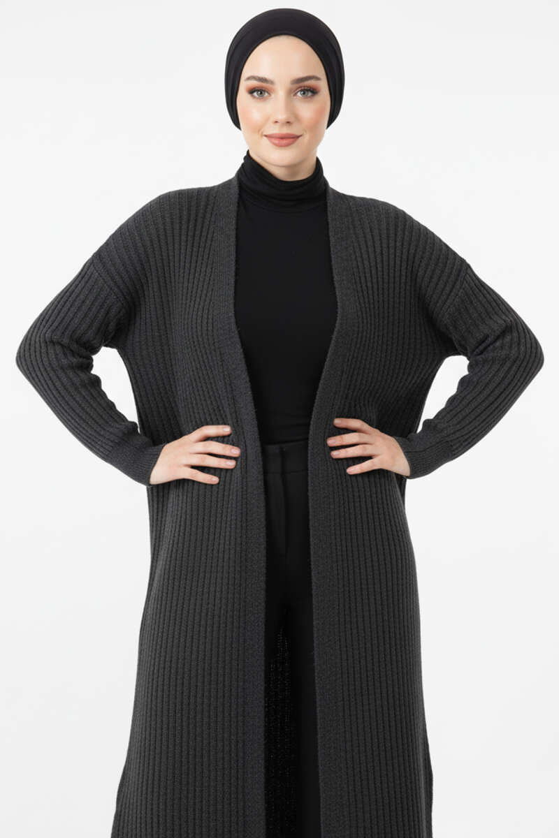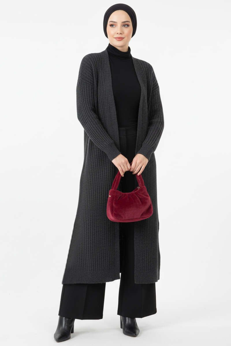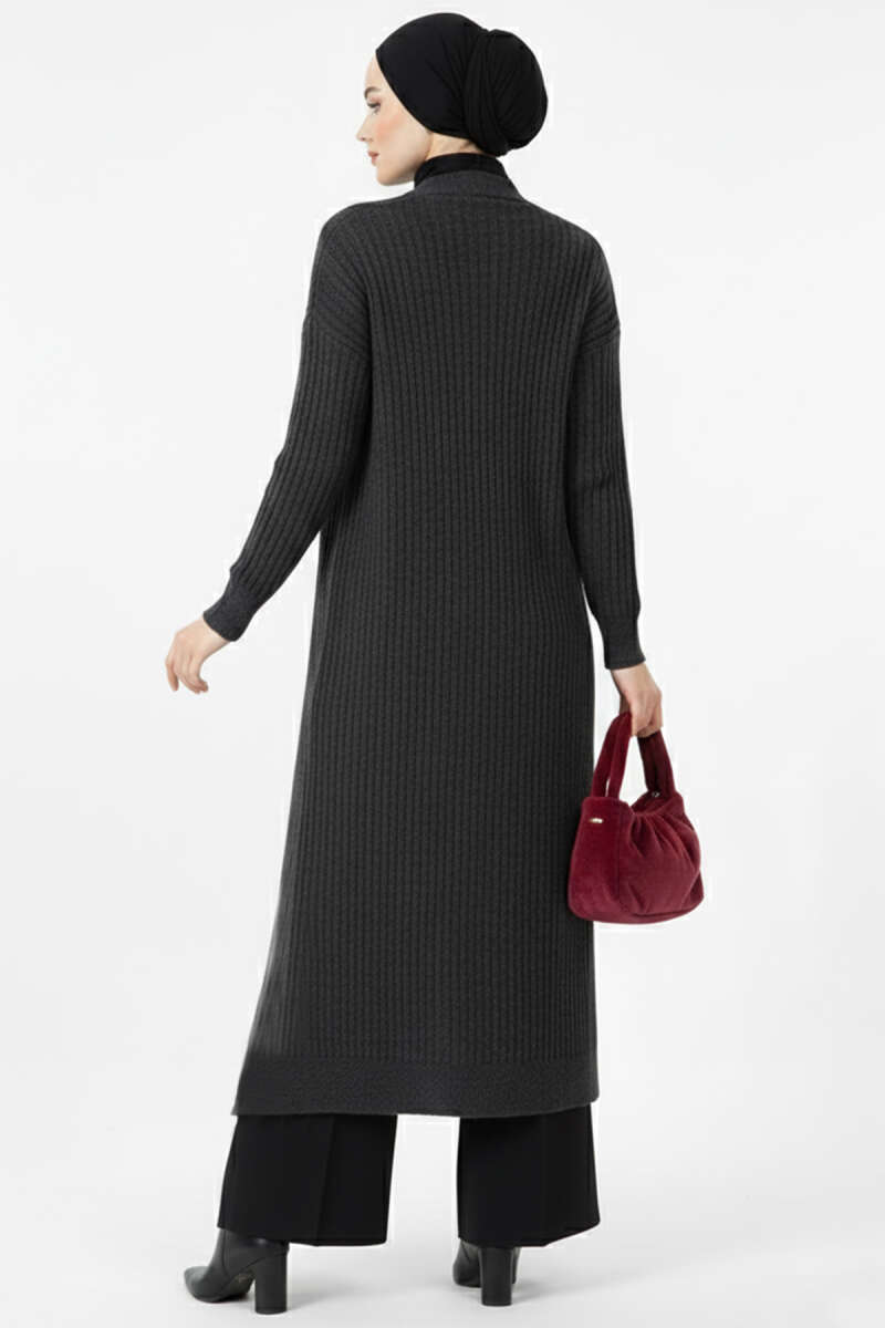Örgü Kabartma Desenli Uzun Triko Hırka Gri