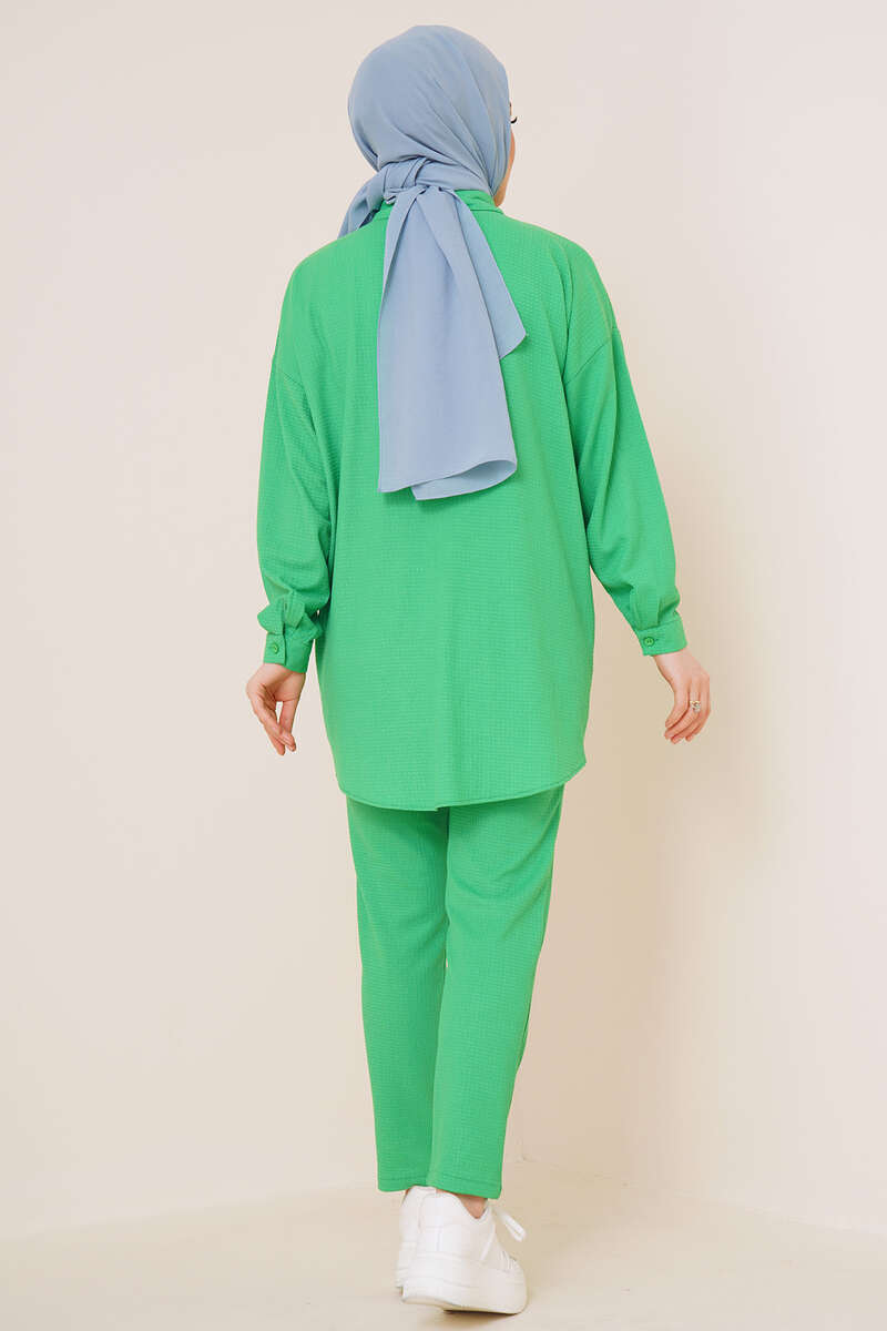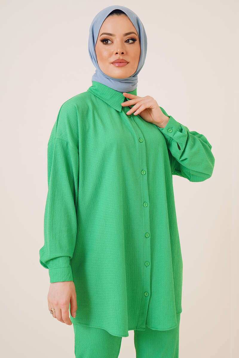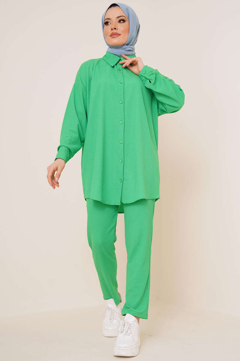 Yeni sezon ikili takımımız şık ve sade görünümüyle sizler için geldi. Takımımız bürümcük kumaştan yapılmıştır. Oldukça rahat yapıdadır. Gömleğimiz uzun ve salaştır. Önü ve bilekleri düğmelidir. Pantolon beli lastikli cepsiz modeldir. Her ortamda rahatlıkla giyebilirsiniz. Farklı renk seçenekleri mevcuttur.