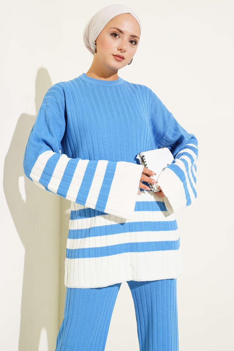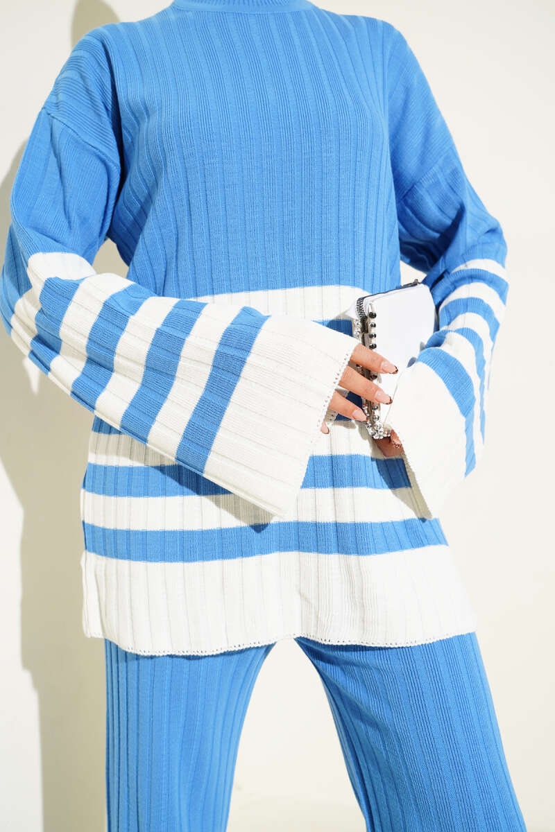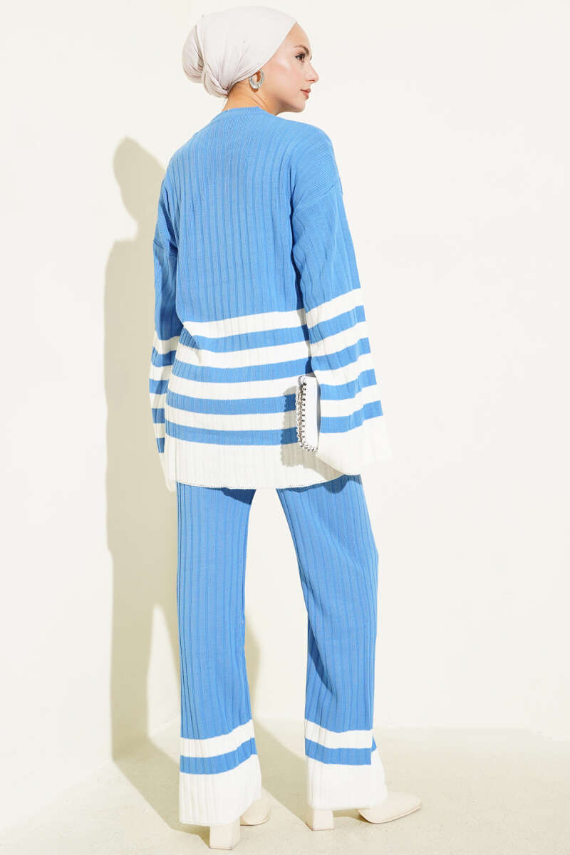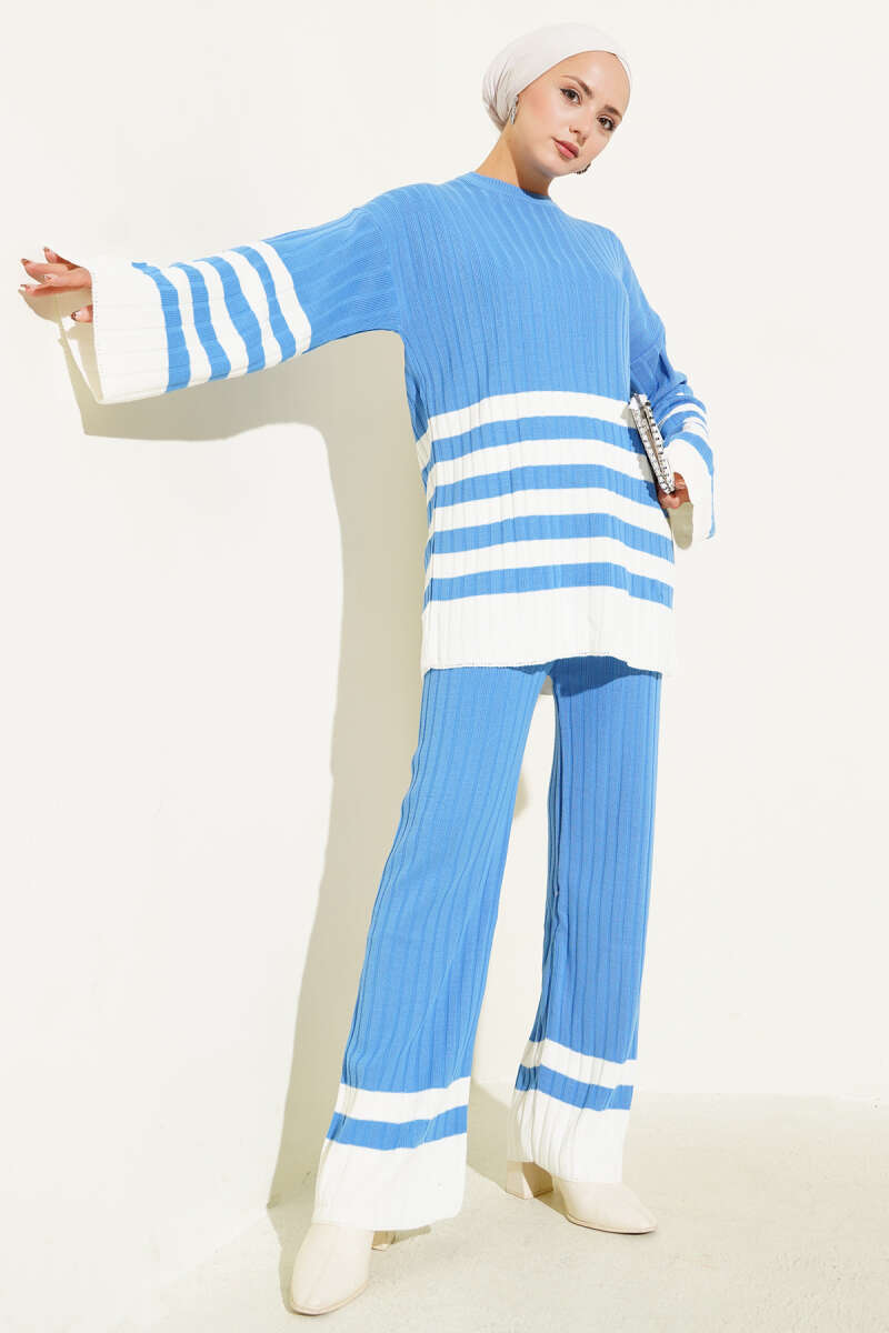 Taşlı Baklava Desen Triko İkili Takım Buz Mavisi