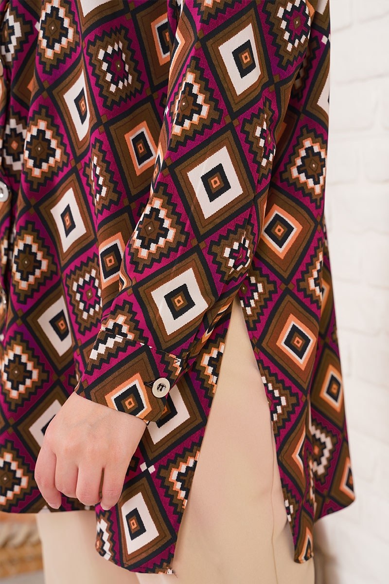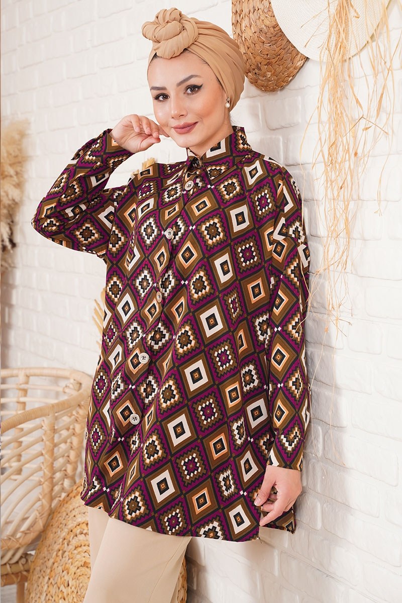 Desenli gömlekler bu sezon çok moda. Salaş yapısı sayesinde hareket kabiliyetinizi engellemeyecektir. Boydan aktif kullanılabilir düğmeli olan gömleğin yakası klasik gömlek yakadır. Kot ve kumaş pantolonlarınızla kombinleyebileceğiniz taba gömlek günlük ve özel günlerinizin kurtarıcısı olacaktır. Kol katlama detayı mevcut değildir. Etek yanlarında yırtmaçları bulunmaktadır. Kol bilekleri düğmelidir.