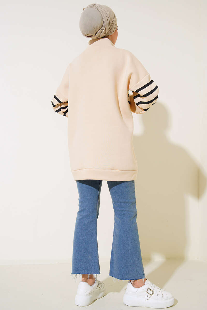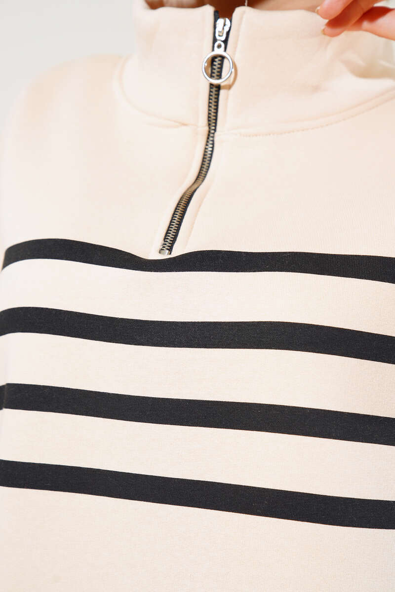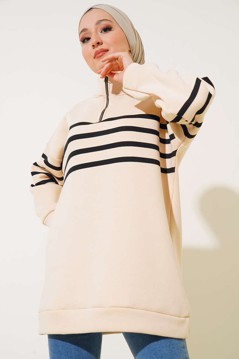 Sweatshirtimüzün yakası fermuar detaylıdır ve fermuar aktif kullanılmaktadır. Üzerinde ki yatay şeritler kolunda da devam etmektedir. İçi şardonlu olan tuniğimiz kışın vazgeçilmezi olacak ve sizleri sıcacık tutacaktır.