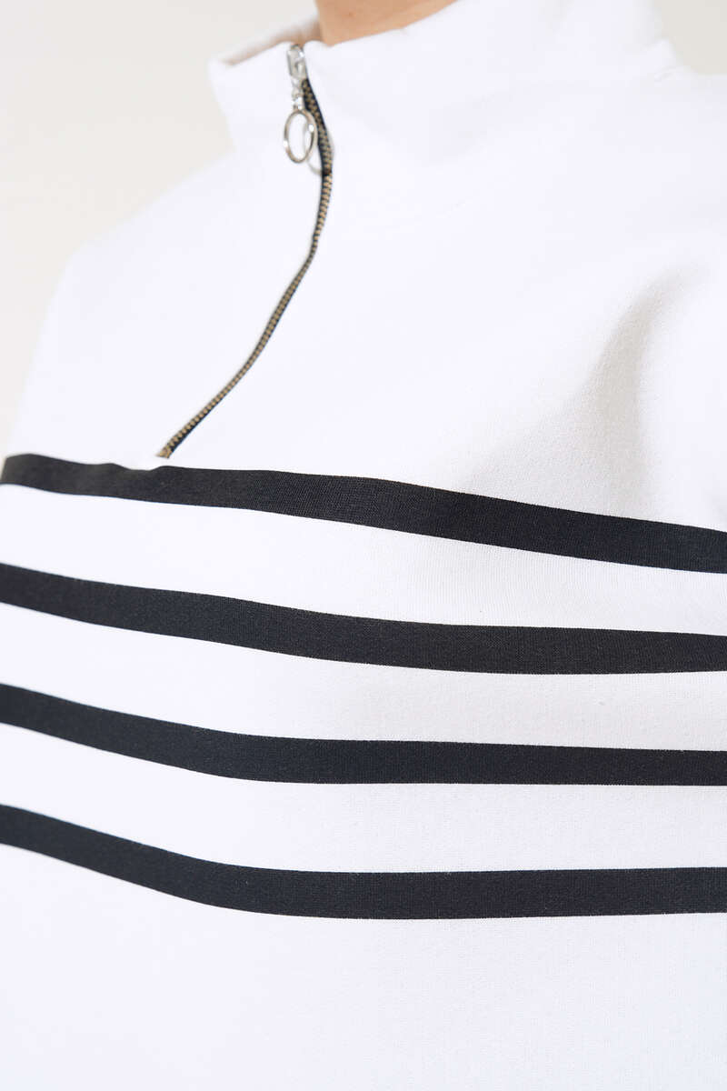 Sweatshirtimüzün yakası fermuar detaylıdır ve fermuar aktif kullanılmaktadır. Üzerinde ki yatay şeritler kolunda da devam etmektedir. İçi şardonlu olan tuniğimiz kışın vazgeçilmezi olacak ve sizleri sıcacık tutacaktır.
