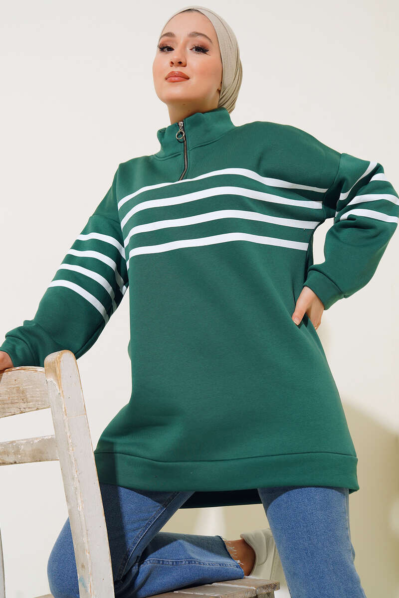 Sweatshirtimüzün yakası fermuar detaylıdır ve fermuar aktif kullanılmaktadır. Üzerinde ki yatay şeritler kolunda da devam etmektedir. İçi şardonlu olan tuniğimiz kışın vazgeçilmezi olacak ve sizleri sıcacık tutacaktır.