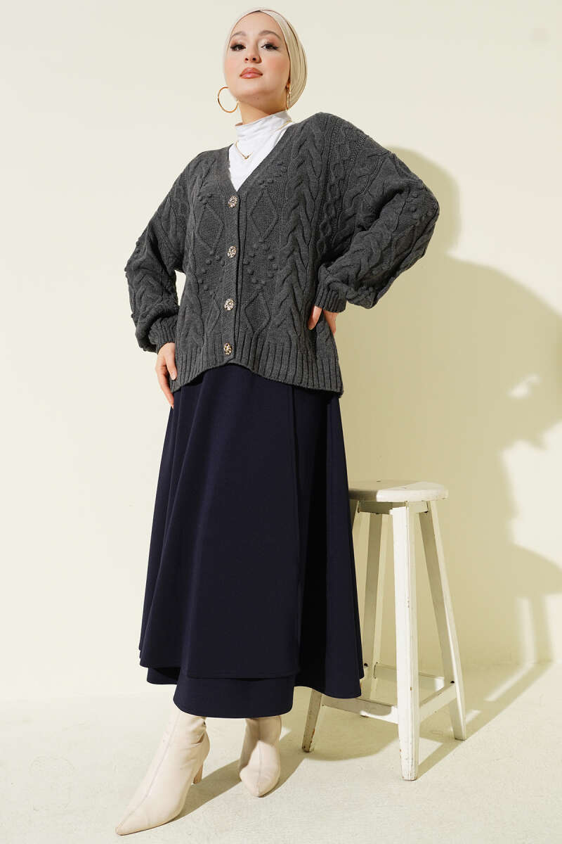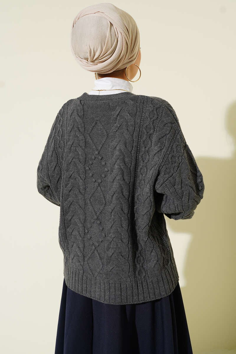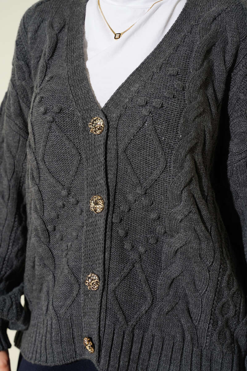 Zigzag Kabartmalı Triko Uzun Hırka Füme