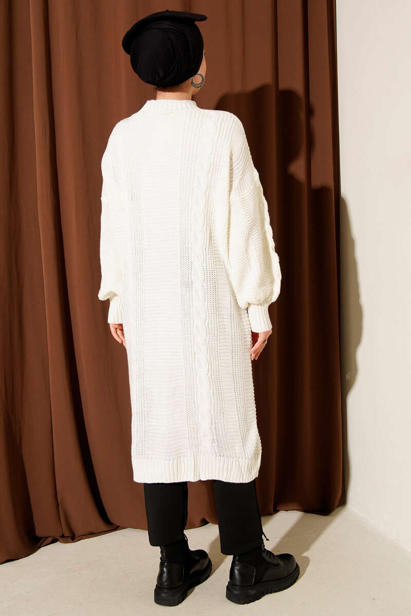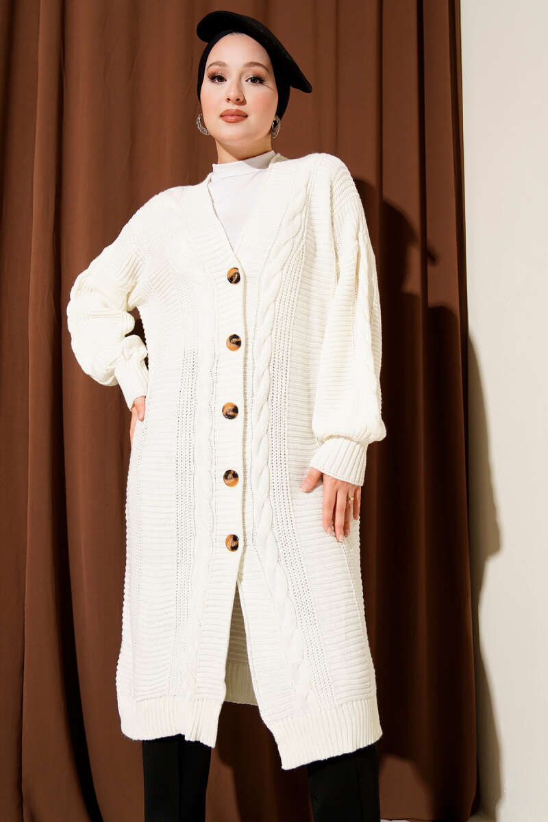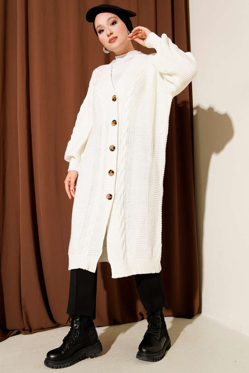 Sarmal Detaylı Düğmeli Uzun Triko Hırka Ekru