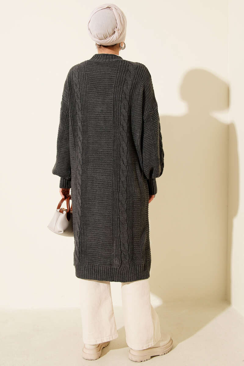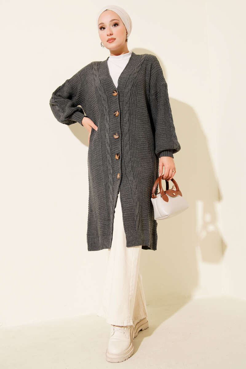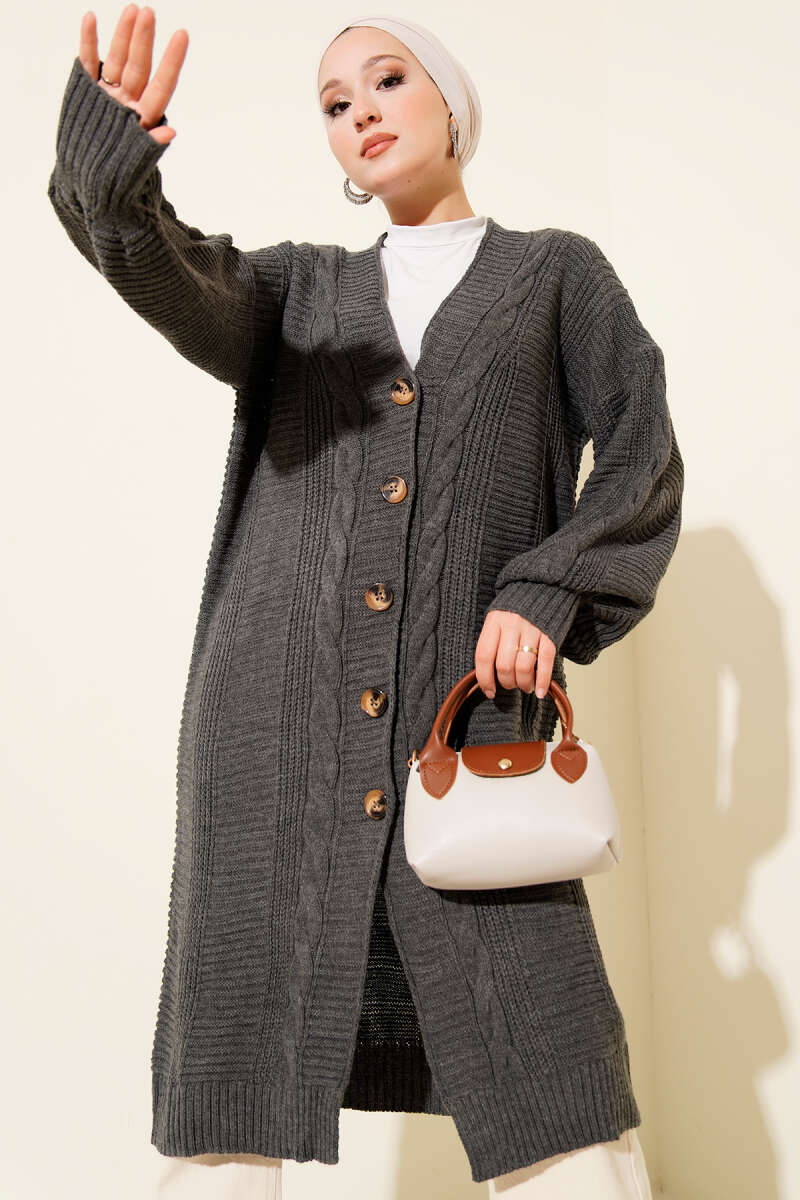Sarmal Detaylı Düğmeli Uzun Triko Hırka Füme