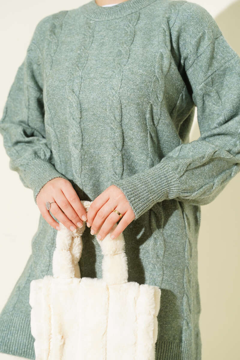 Boğazlı Fitilli Çizgili Triko Elbise Bej