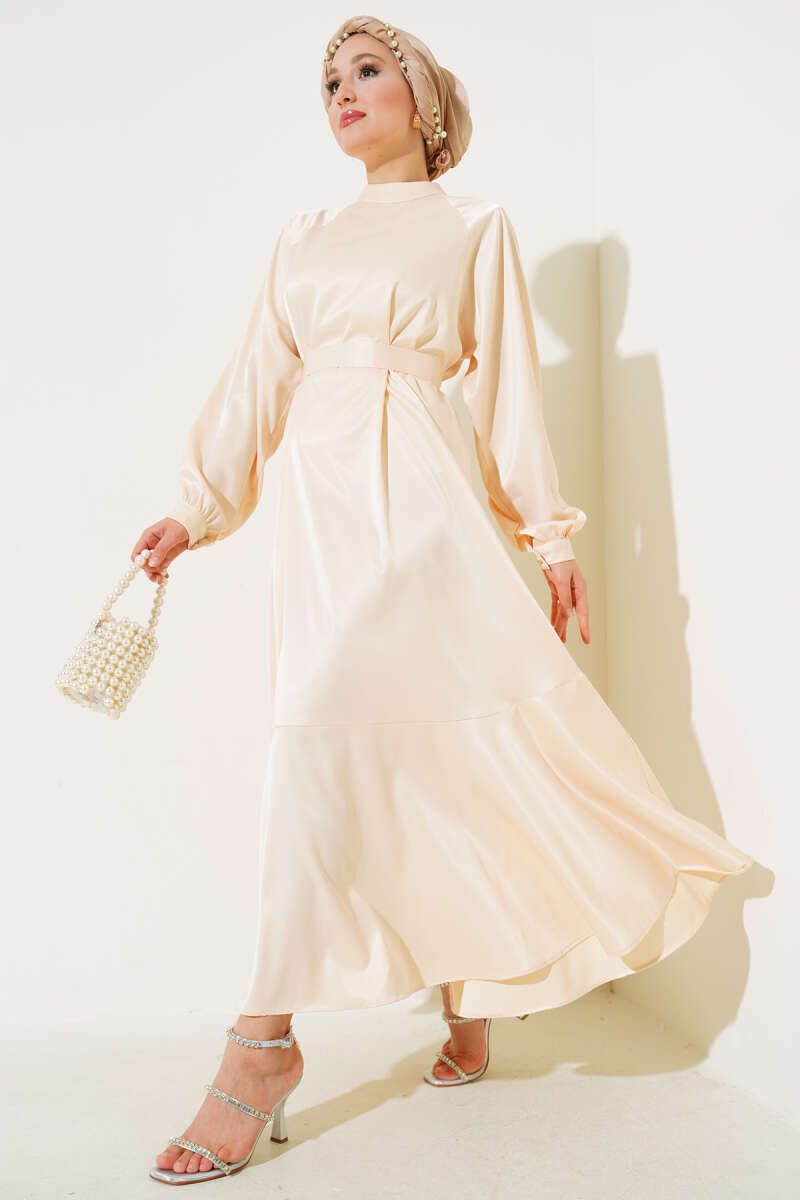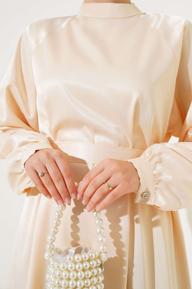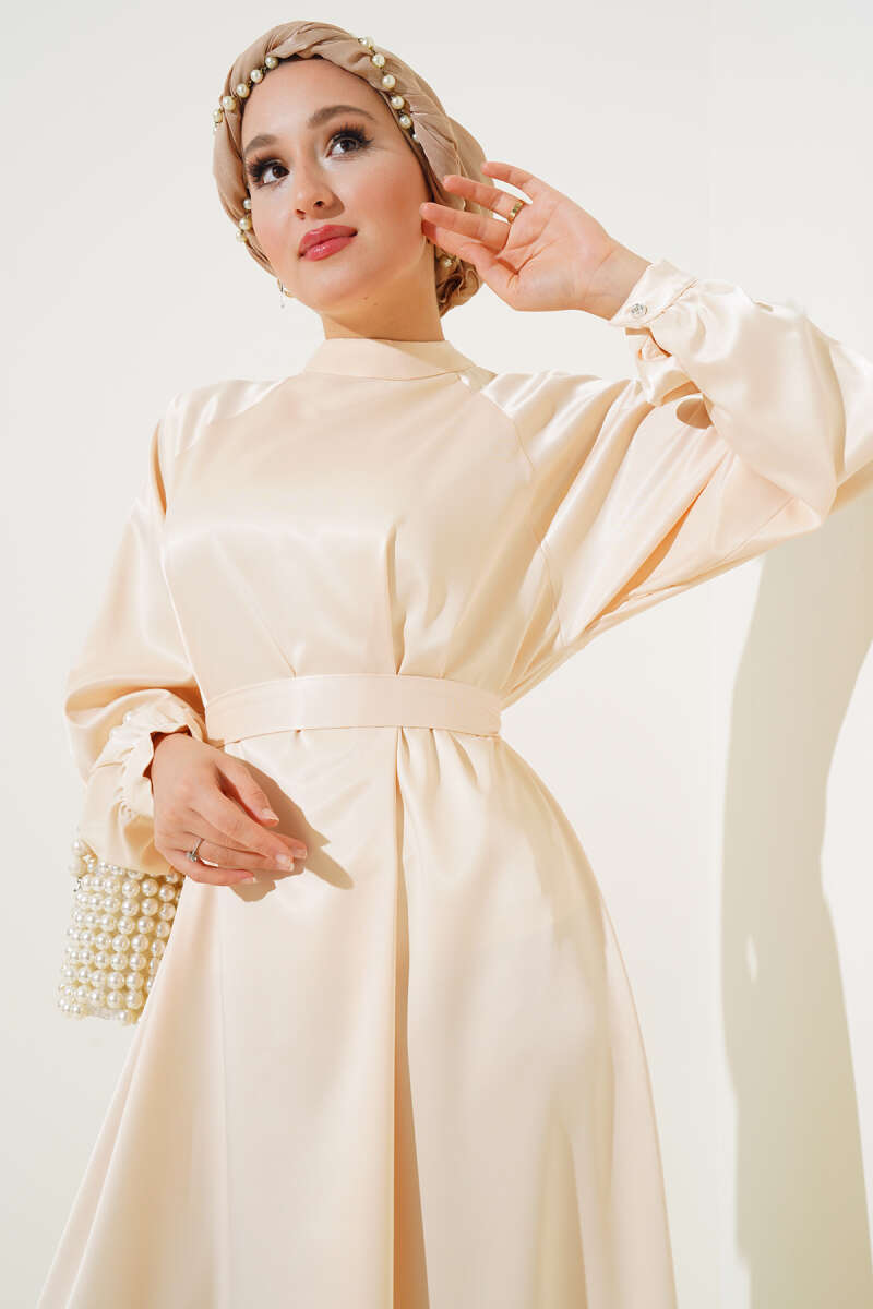 Saten Bel Kuşaklı Elbise Bej
