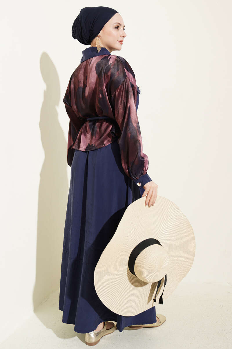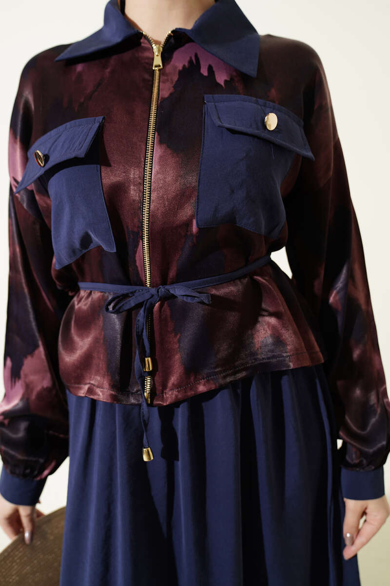 Saten Göğüs Cepli Bluz Etekli Takım Bordo Lacivert