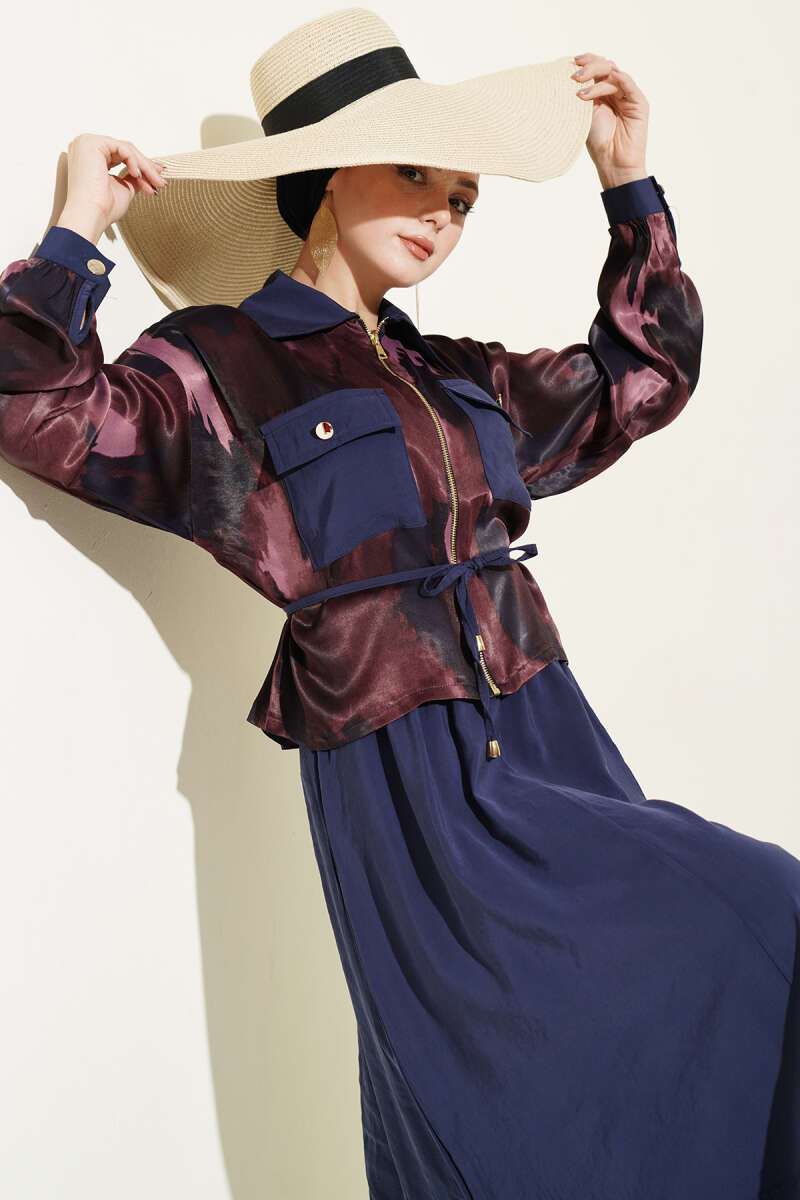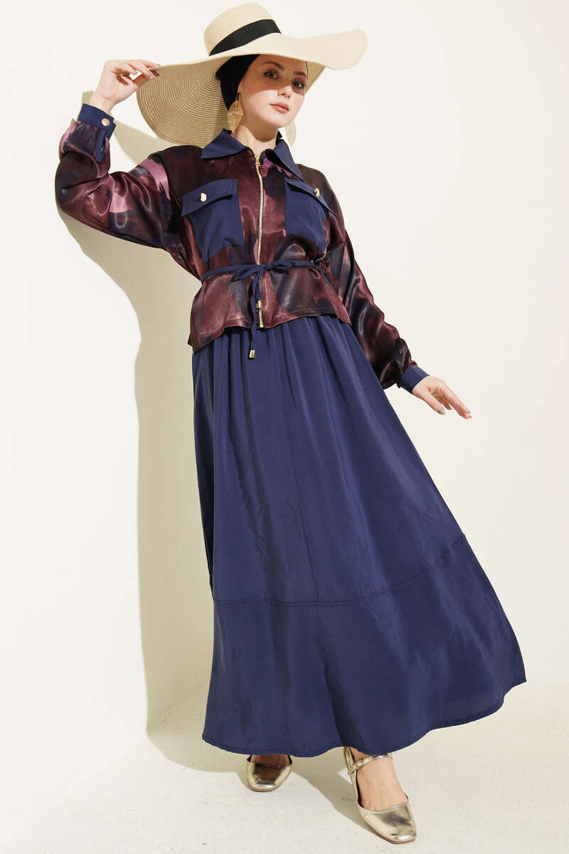 Modern ve iddialı bir tasarıma sahip olan bu takım, üst kısmındaki batik desenli ceket görünümüyle fark yaratıyor. Ön kısmındaki boydan altın rengi fermuar detayı ve kapaklı cepleri, klasik elbiseye dinamik ve spor-şık bir hava katıyor. Belde yer alan bağlama detayı vücut formunu zarifçe vurgularken, dökümlü ve geniş etek kesimi gün boyu konforlu bir hareket alanı sunuyor.