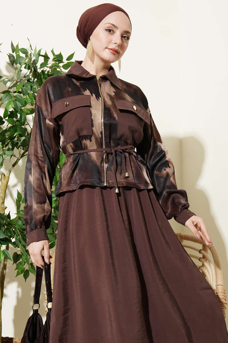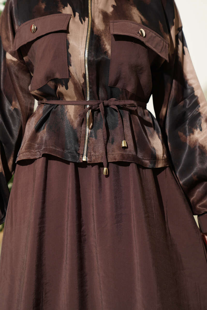 Saten Göğüs Cepli Bluz Etekli Takım Kahve