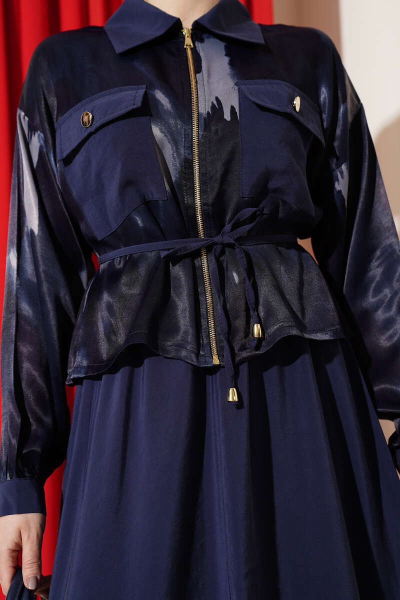Modern ve iddialı bir tasarıma sahip olan bu takım, üst kısmındaki batik desenli ceket görünümüyle fark yaratıyor. Ön kısmındaki boydan altın rengi fermuar detayı ve kapaklı cepleri, klasik elbiseye dinamik ve spor-şık bir hava katıyor. Belde yer alan bağlama detayı vücut formunu zarifçe vurgularken, dökümlü ve geniş etek kesimi gün boyu konforlu bir hareket alanı sunuyor.