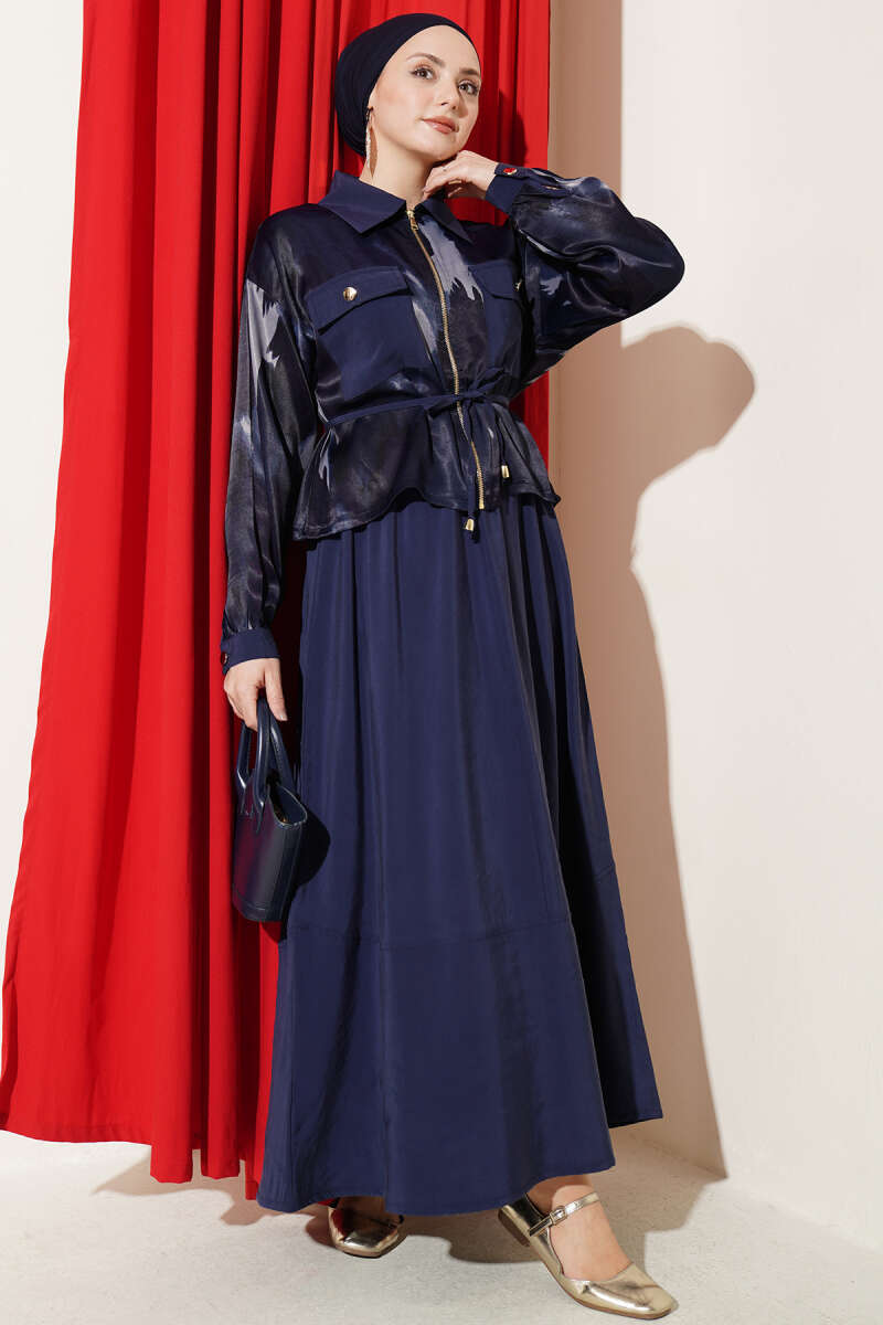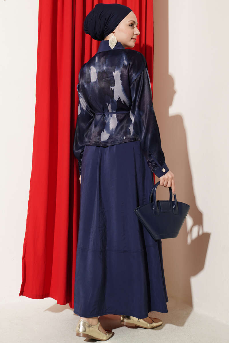 Saten Göğüs Cepli Bluz Etekli Takım Lacivert