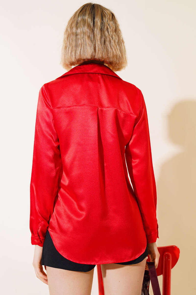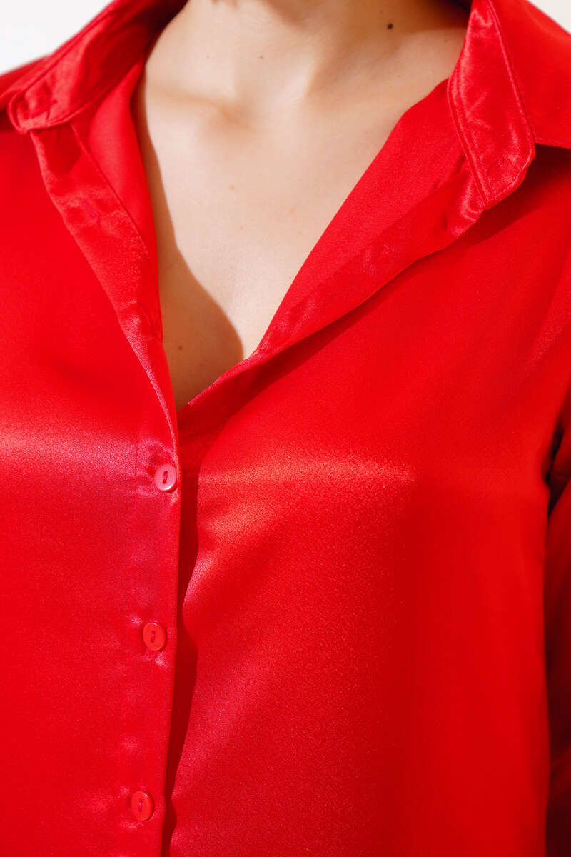 Yeni sezon saten gömlek modelimiz favorilerinizin arasına girecek. Boydan düğmeli modeldir aynı zamanda kol bilekleri de düğmelidir. Saten kumaş olan gömleğimiz kombinlerinizin yıldız parçası olacak.