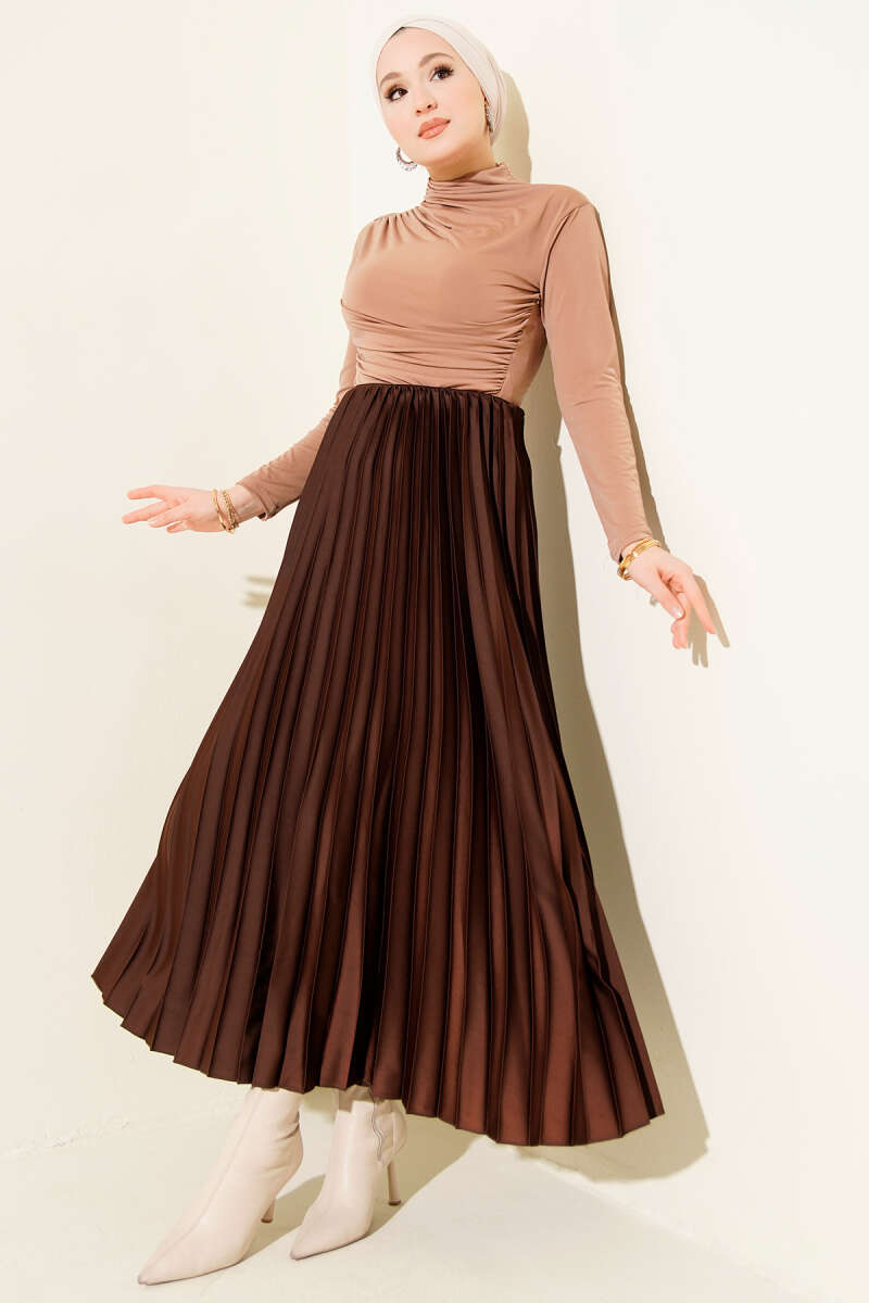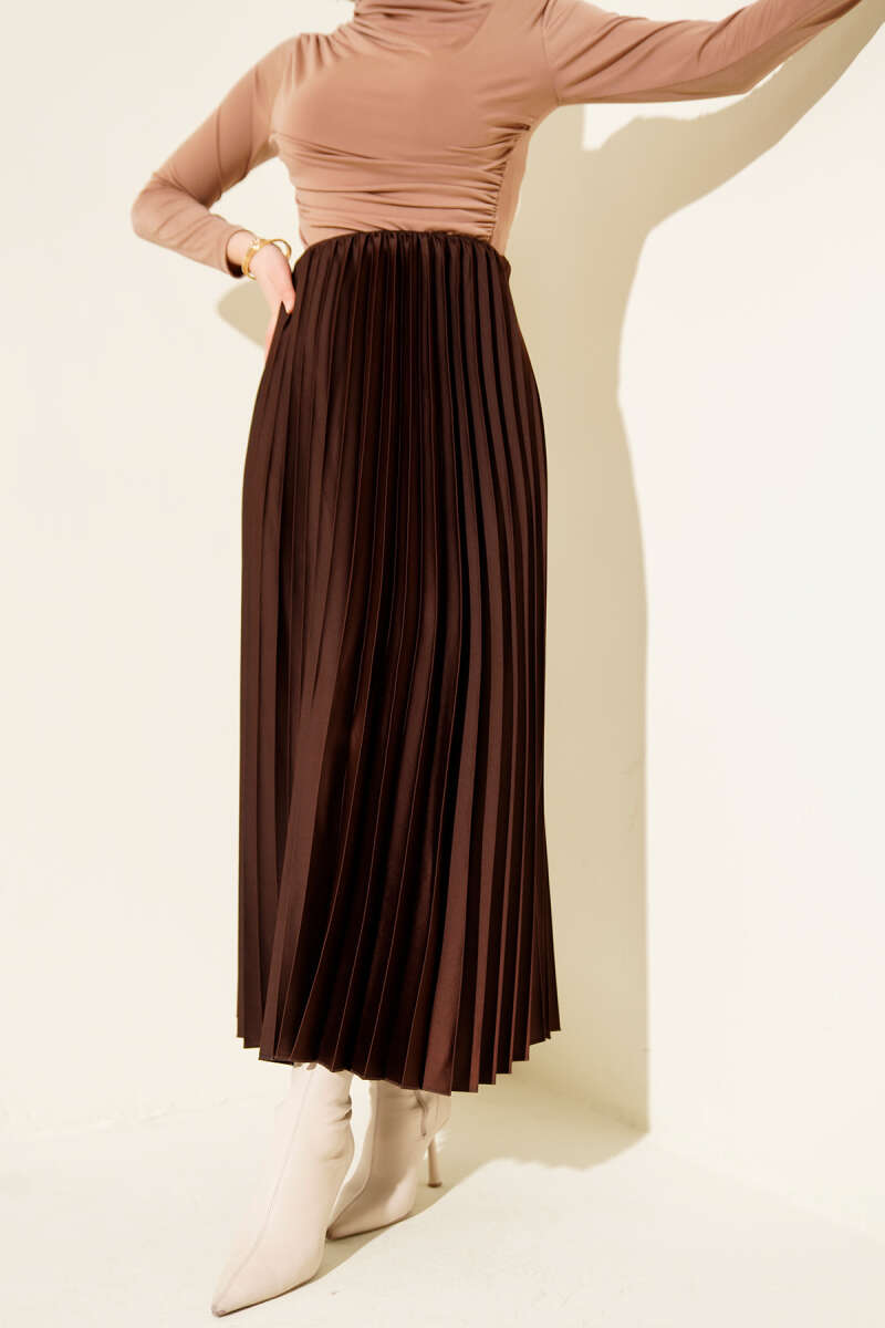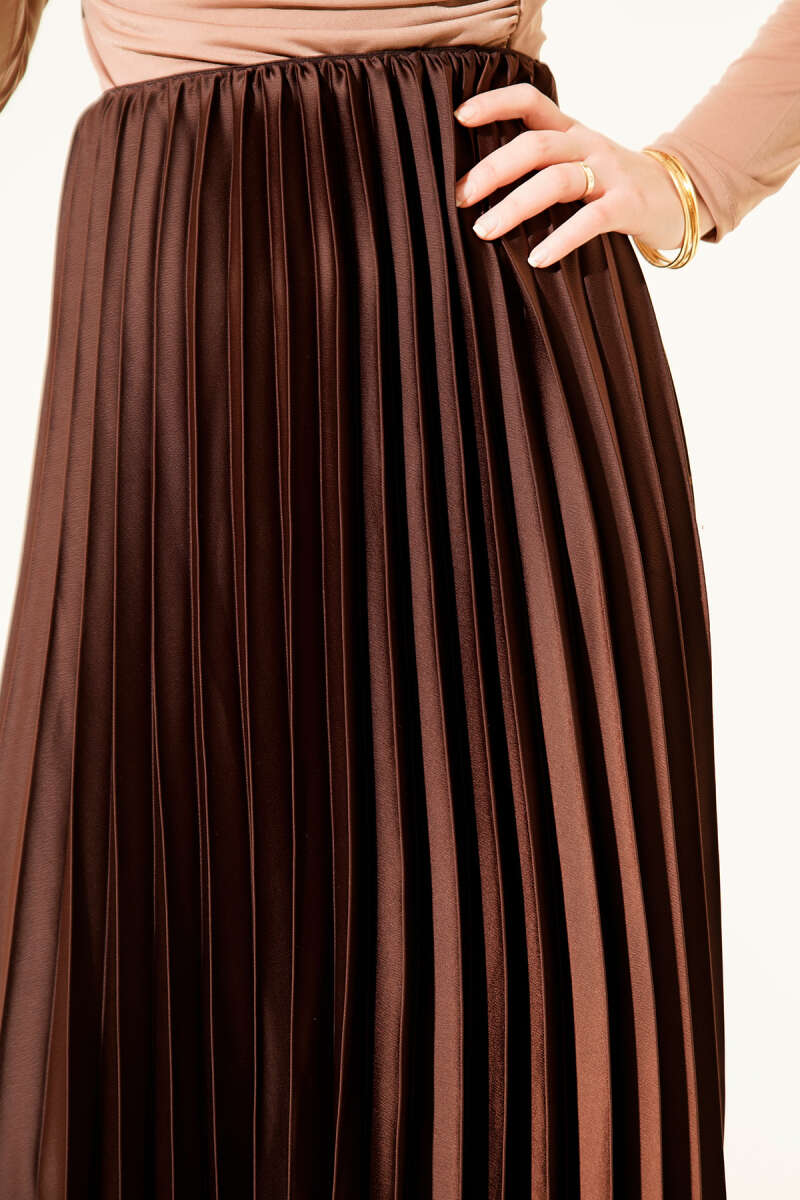 Saten Görünümlü Pileli Etek Bej