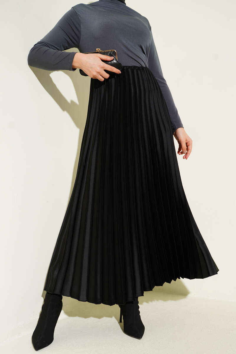 Saten Görünümlü Pileli Etek Lacivert