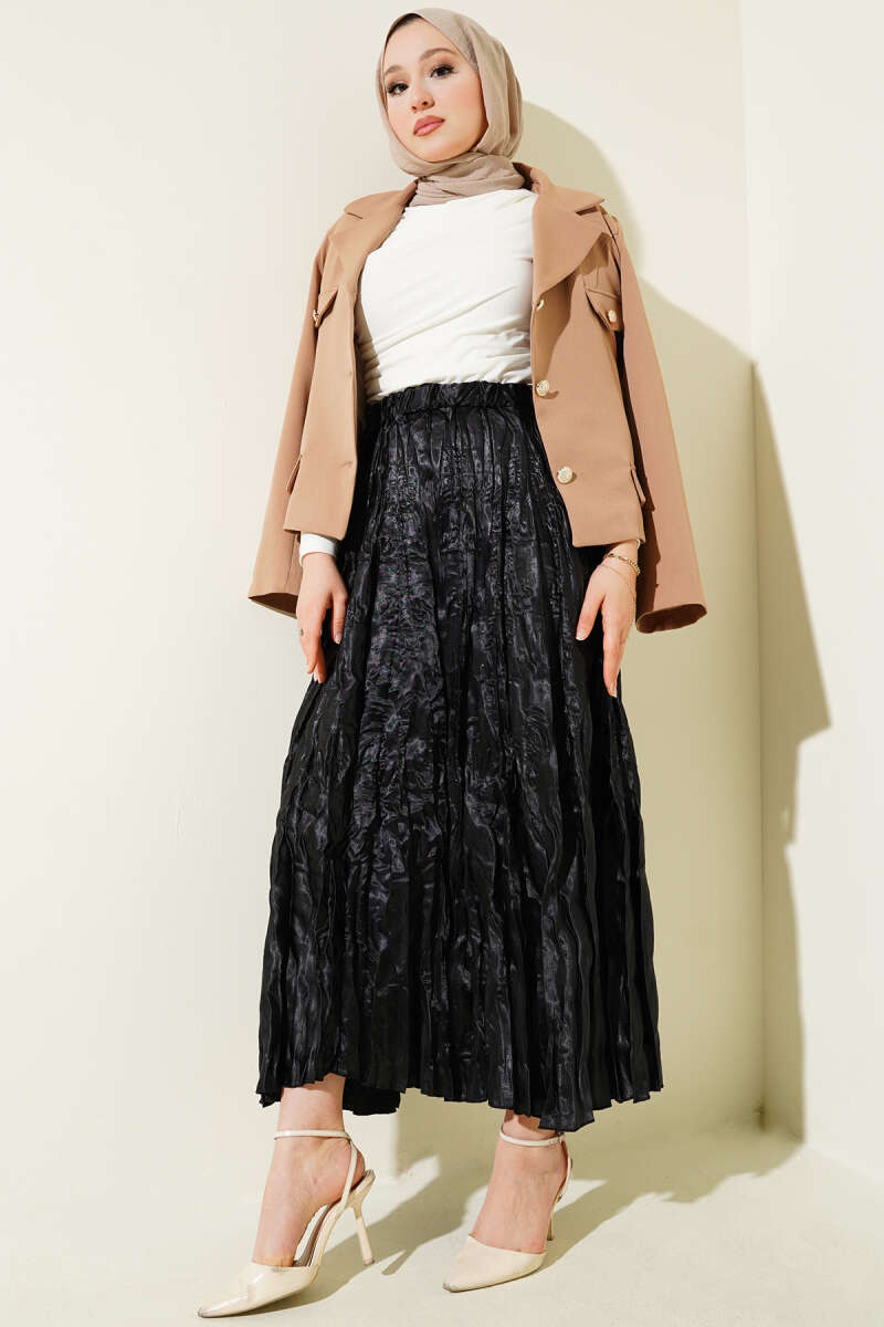 Çift Kemerli Pens Detaylı Kloş Etek Siyah