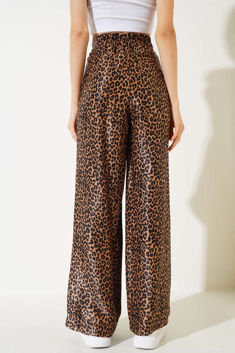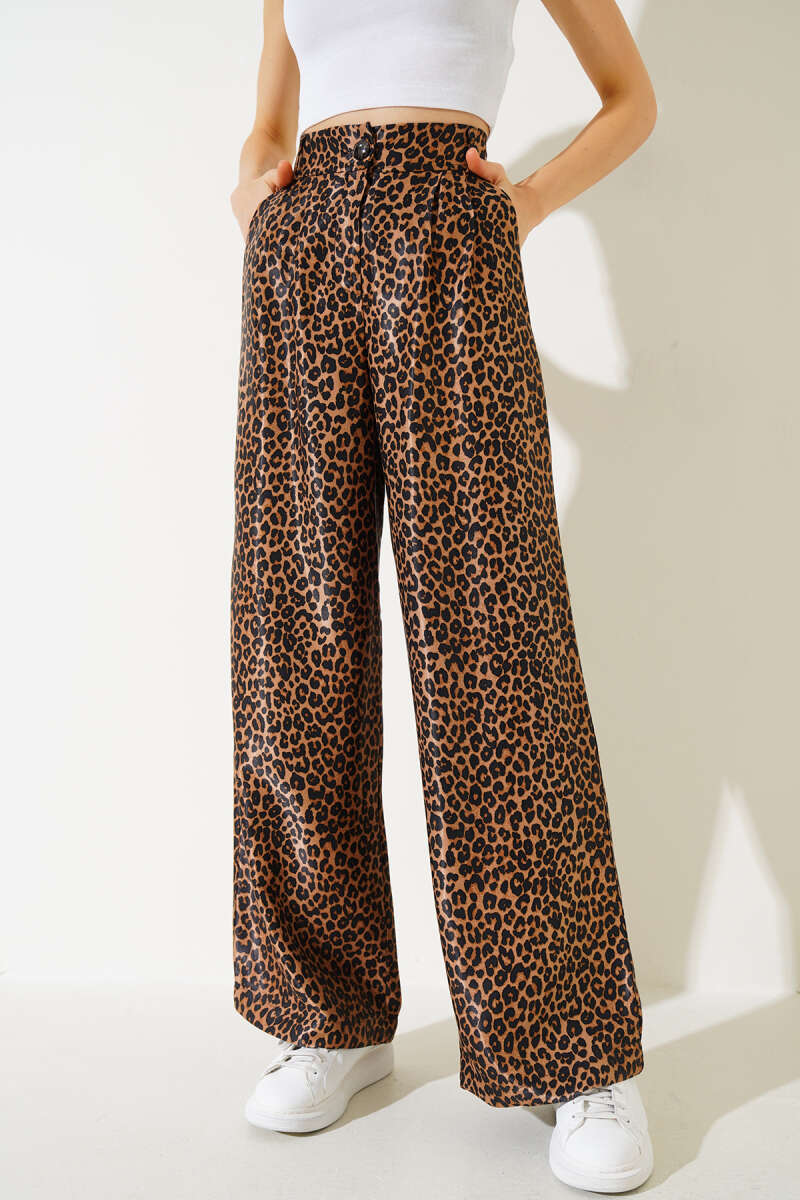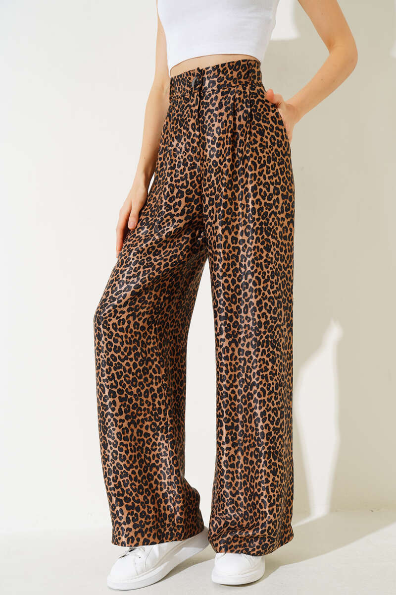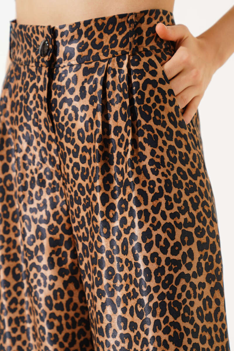 Saten Leopar Desenli Salaş Pantolon Taba