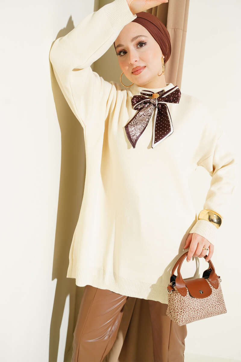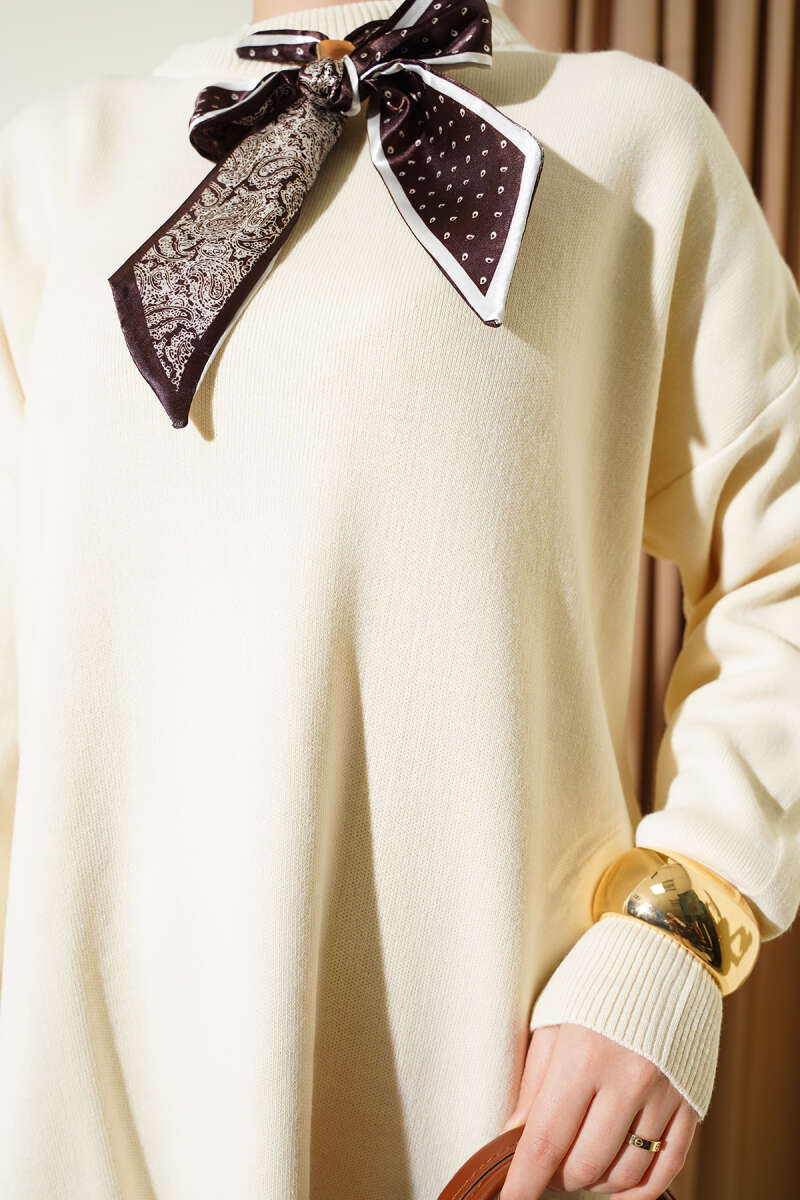 Saten Yaka Fularlı Triko Tunik Yeşil