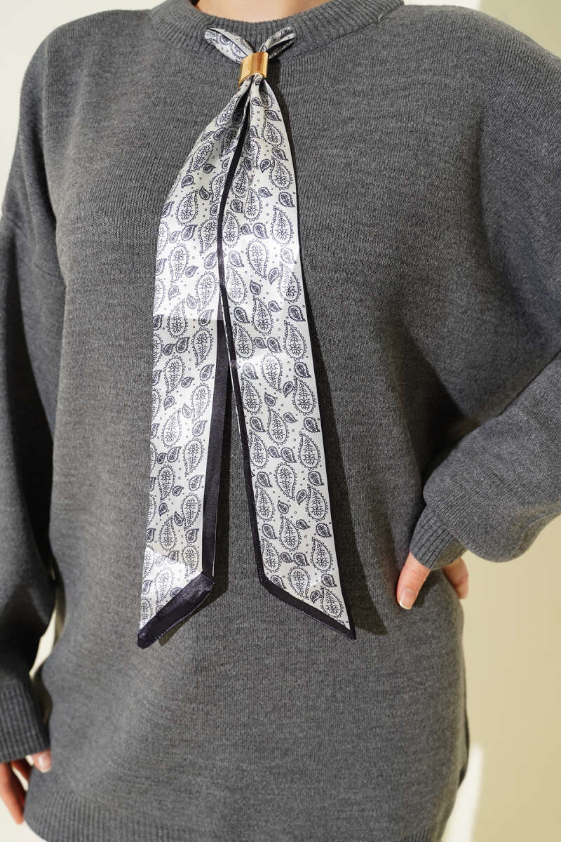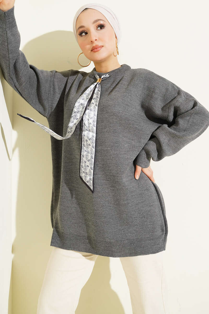 Yaka Fularlı Yumoş Triko Tunik Kahve